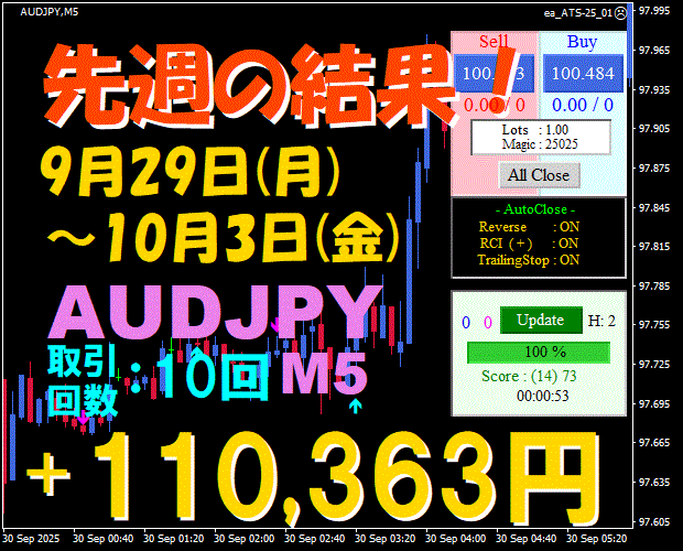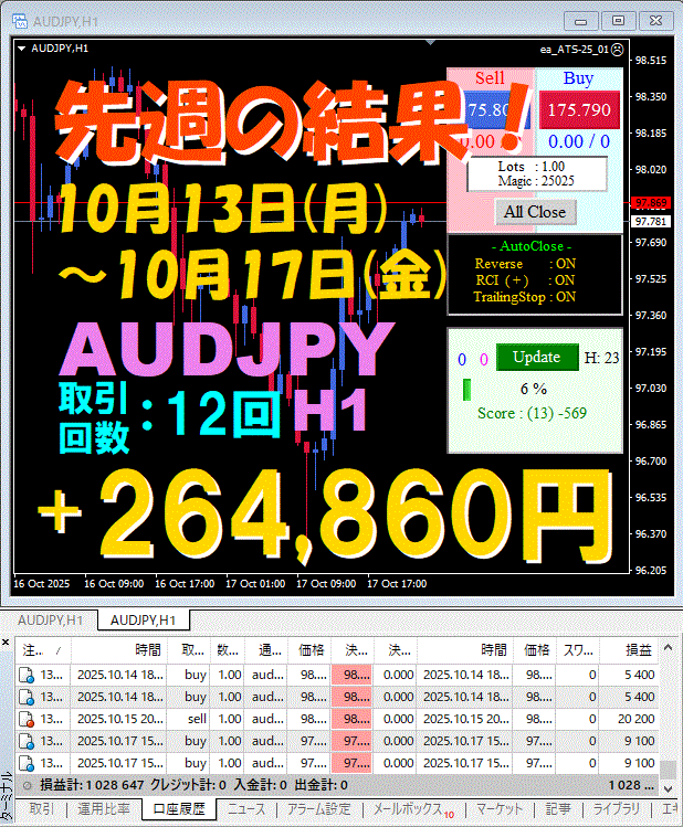 【先週の結果】AUDJPY H1 『ATS-25』10月13日(月)~10月17日(金)