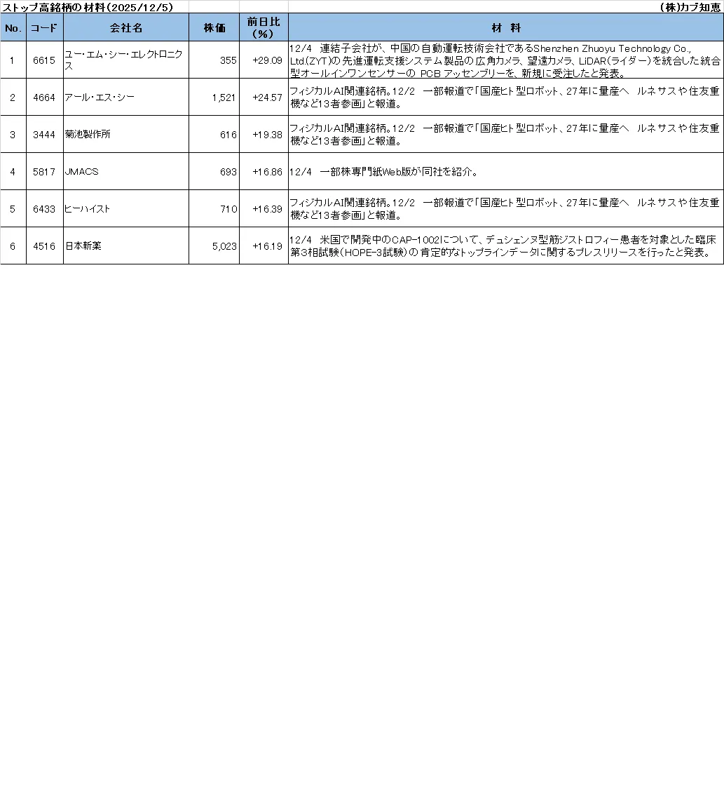ความรู้หัวหอม ストップ高銘柄の材料(2025/12/5)