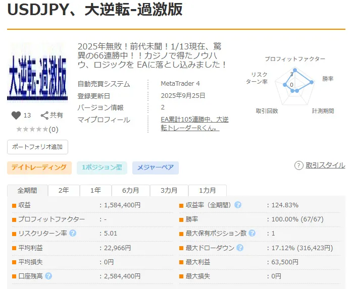 ★★ドル円รวมชนะต่อเนื่อง 119 นัด☆☆ปี 2025 ไม่แพ้!!☆☆ก่อน 1/15 ไม่มีใครเทียบได้! EA ที่ชนะครบ 67 นัดเต็ม และ 52 ชนะ และ 12 เกมติดต่อกันมีอยู่! แล้วเป็นครั้งแรกของโลก!? จัดถ่ายทอดสดวิธีการยุคถัดไปเพื่อบอกทิศทาง EA