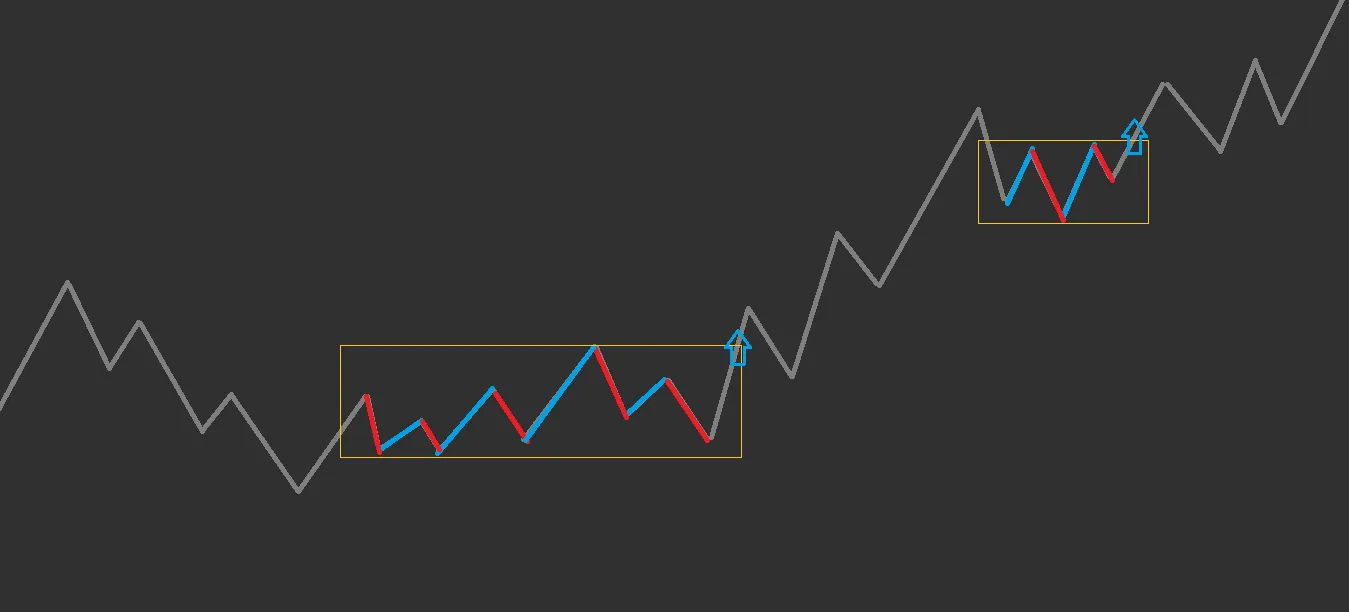 โดยรวมสอดคล้องกับภาพ เราสามารถตรวจจับกรอบช่วงที่นิ่งออกมาได้ เมื่อราคาเริ่มเคลื่อนที่ สีจะกลายเป็นสีเทา