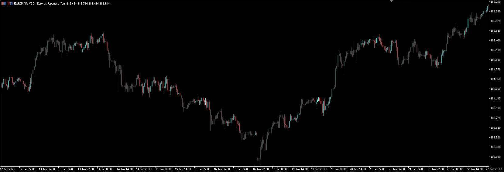 ดังตัวอย่างด้านล่าง ผมคิดจะสร้างอินดิเตอร์ที่ตรวจพบขอบเขตของช่วงและเติมสีให้กับเทียนที่เกี่ยวข้อง