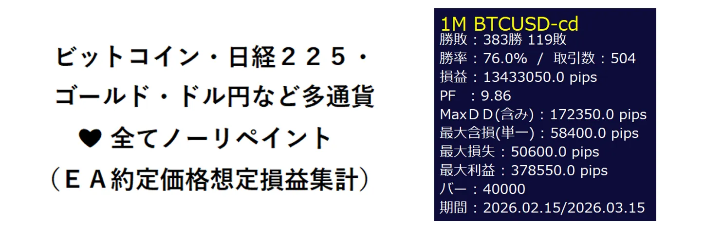 อัตราชนะประมาณ 60%–70% และ PF ประมาณ 5 ขึ้นไป. ด้วยการคาดการณ์ EA จะคำนวณจากราคาที่ห่างจากสเปรดเพื่อให้การเปรียบเทียบมีความแม่นยำ จนได้ผลลัพธ์ที่แม่นยำแม้จะมีการรีสตาร์ท และลูกศรจะไม่หายไปหรือตื่นขึ้นมาNo Repaintลูกศรที่แสดงบนหน้าจอจะไม่หายไปเมื่อกรอบแท่งกำลังสร้างขึ้น