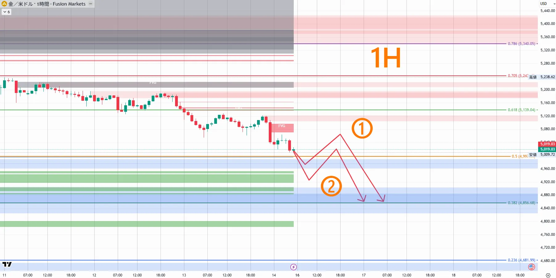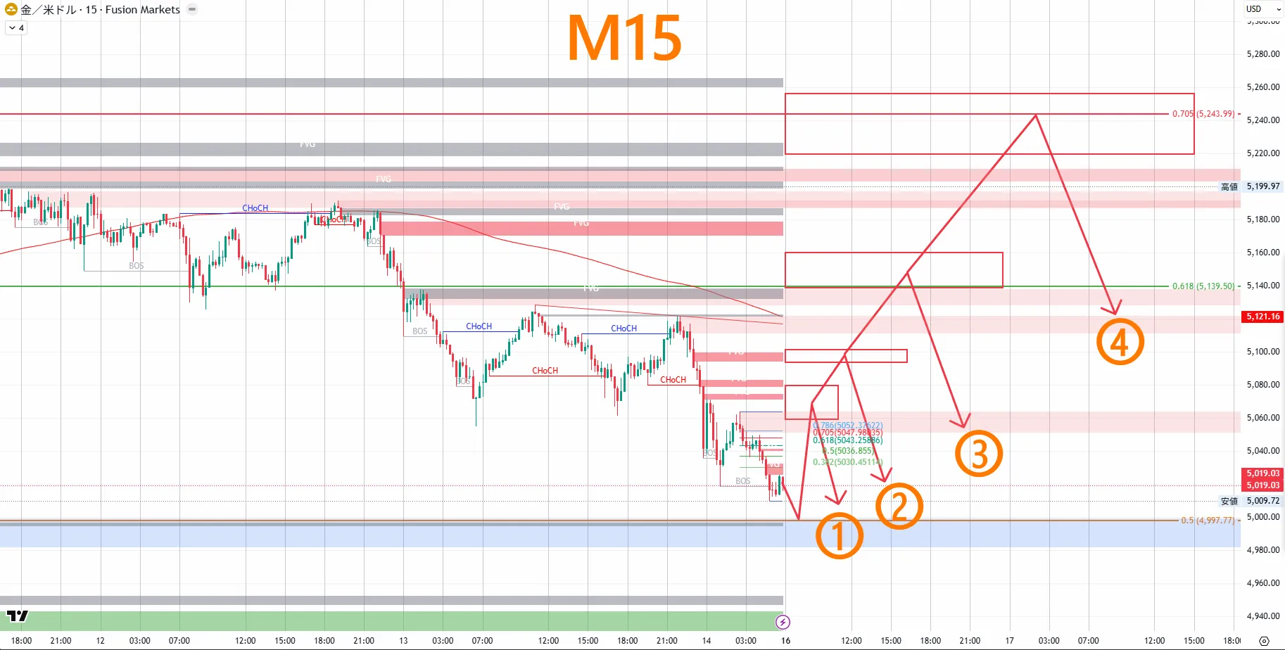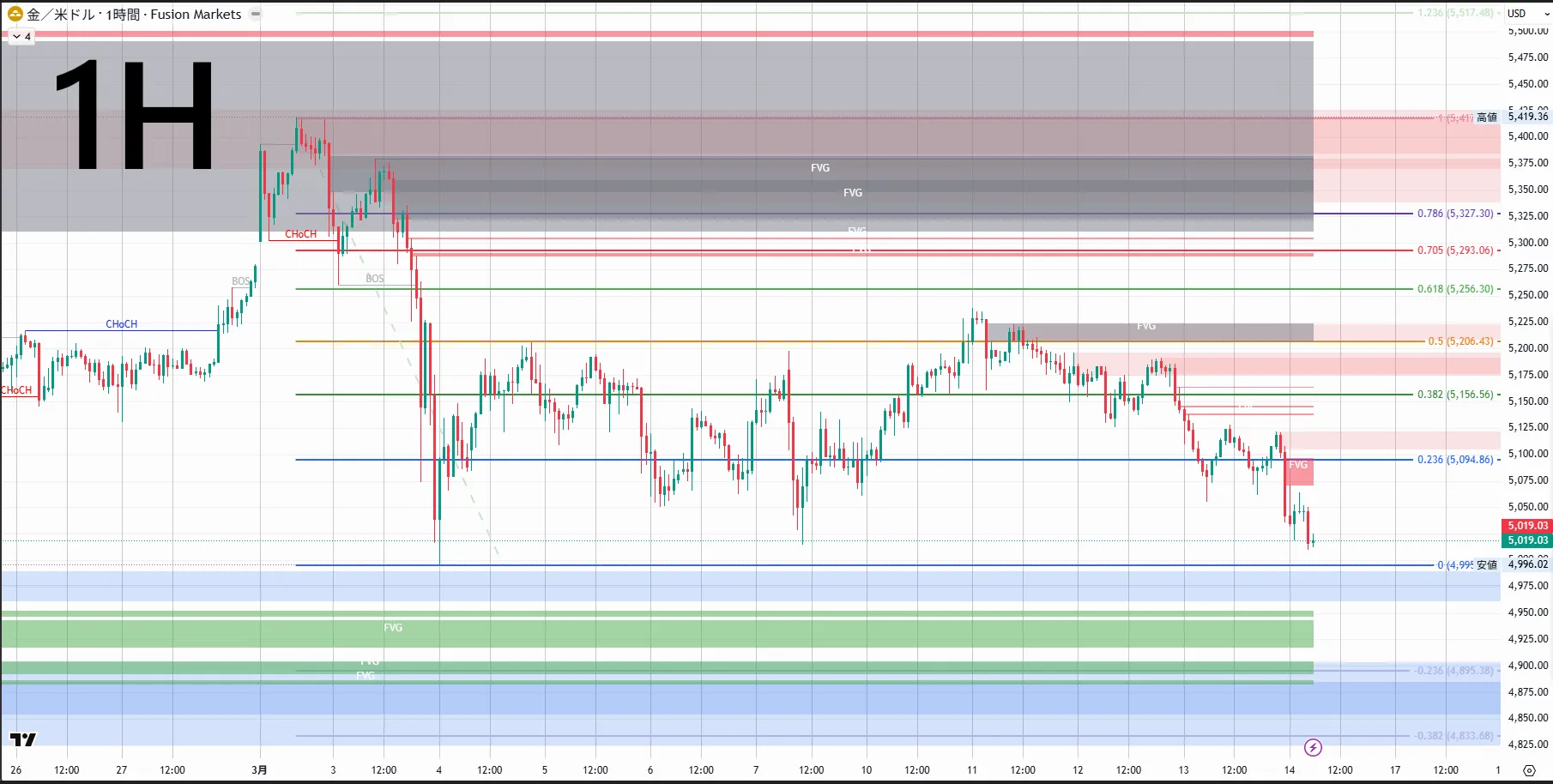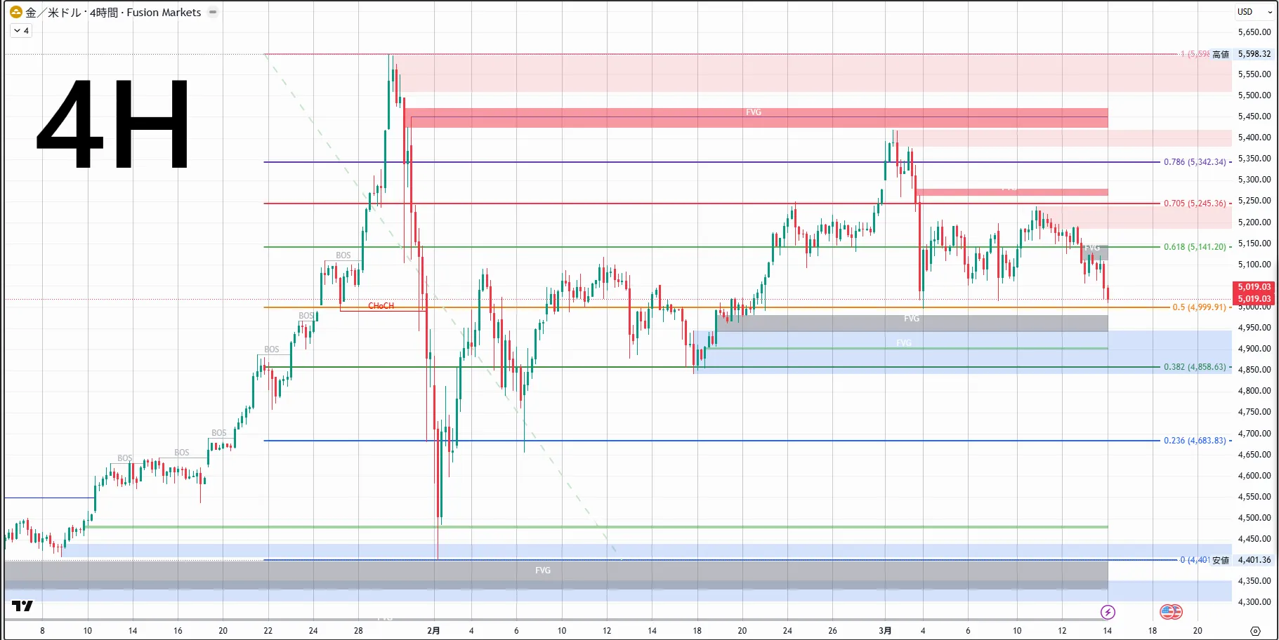 5,598.32หลังจากเกิด CHoCH ใน 4 ชั่วโมง ราคากลับลงสู่時間足CHoCHlower high・lower lowต่อเนื่องเป็นโครงสร้างตลาดขาลง月末〜2月初ต้นปีหลังจากลงทำจุดสูงสุด月28วันที่5,419.36ท้ายที่สุดราคาพุ่งขึ้นและกลับลงมา ในกราฟ 4 ชั่วโมง CHoCH ถูกยืนยัน และราคากลับลงตอนนี้時間足菲โบ (Fibonacci) EQP(4,999.91)ขึ้นถึงระดับประมาณ5,019ในช่วงสัปดาห์นี้