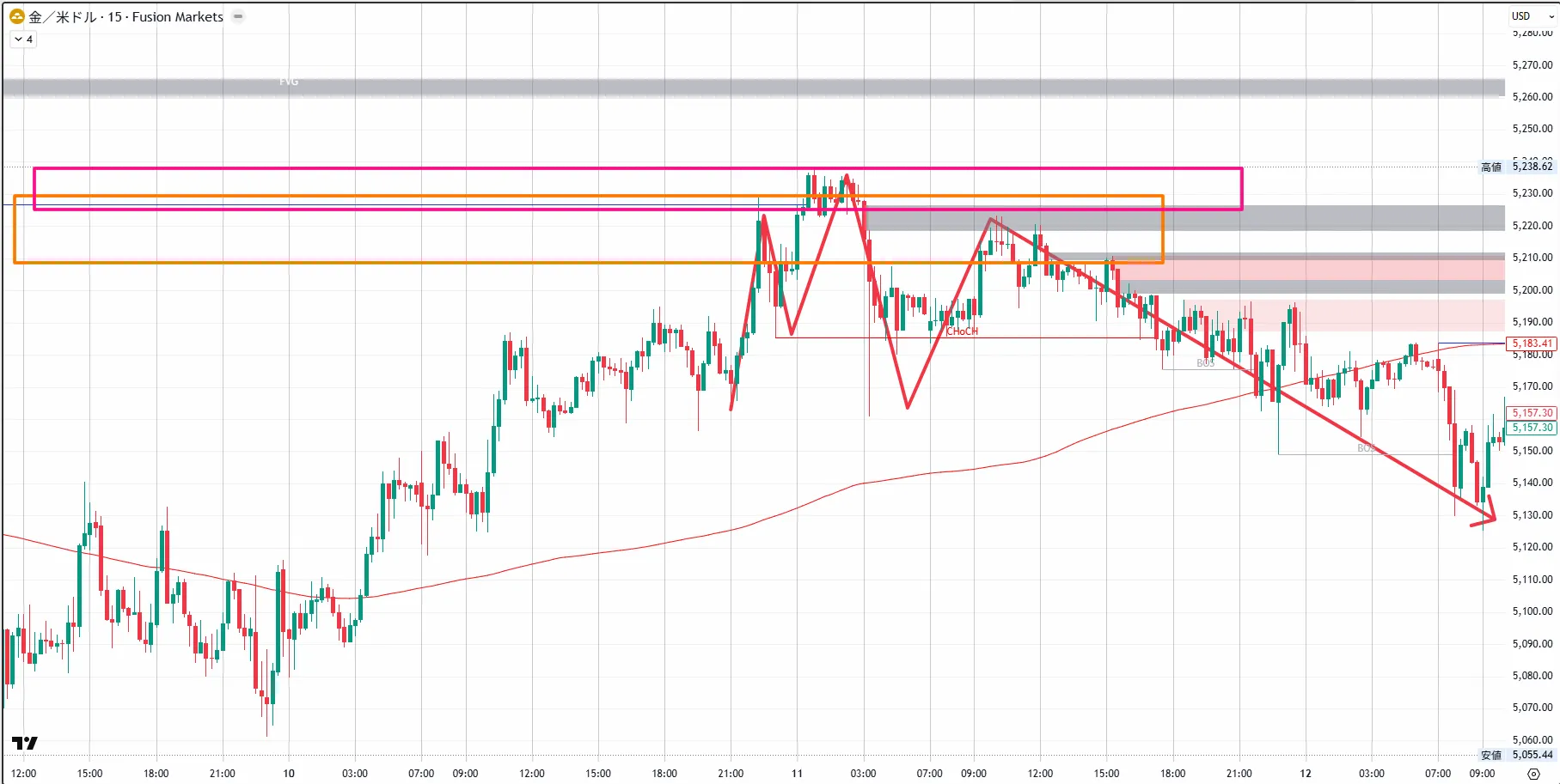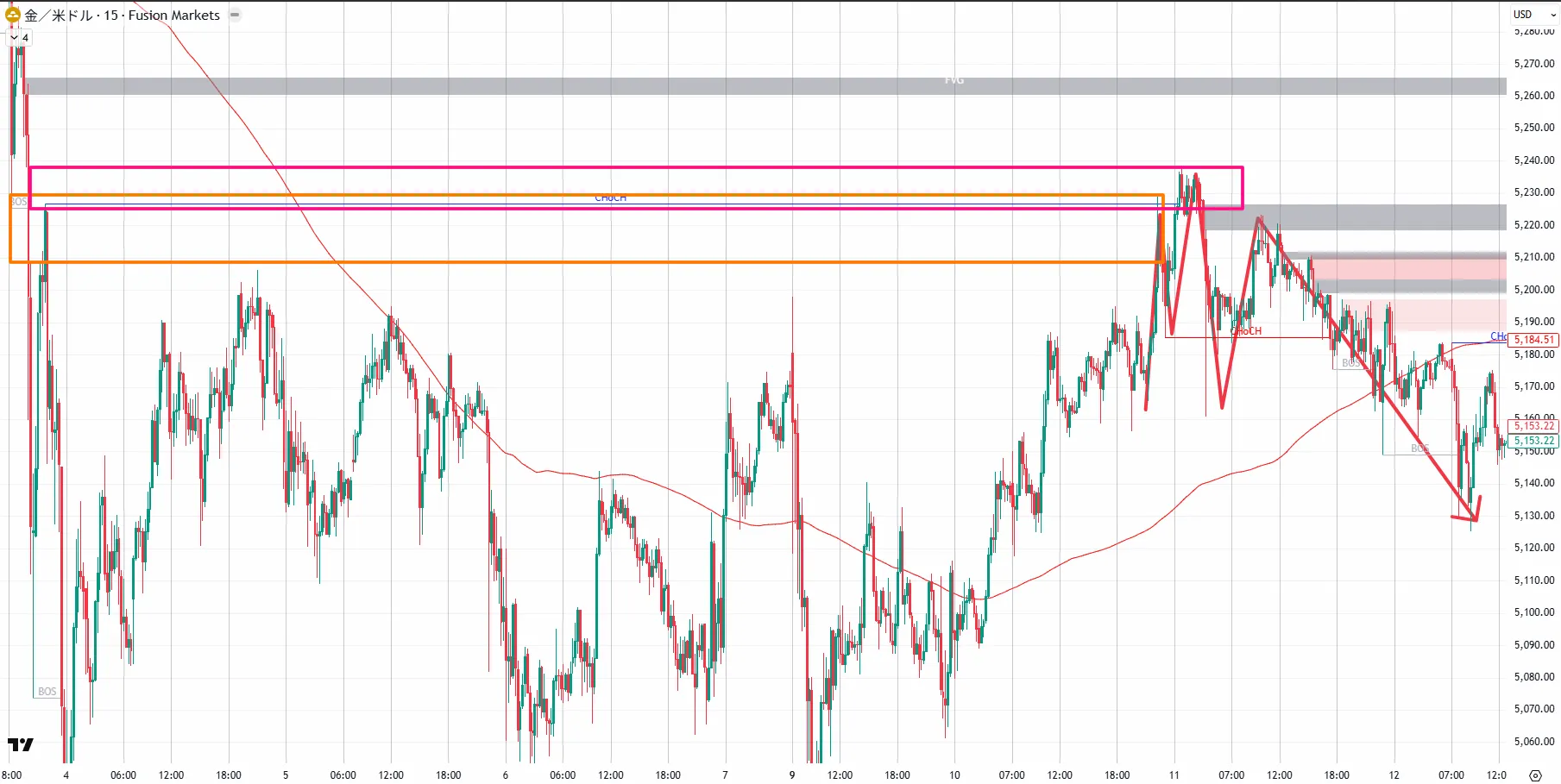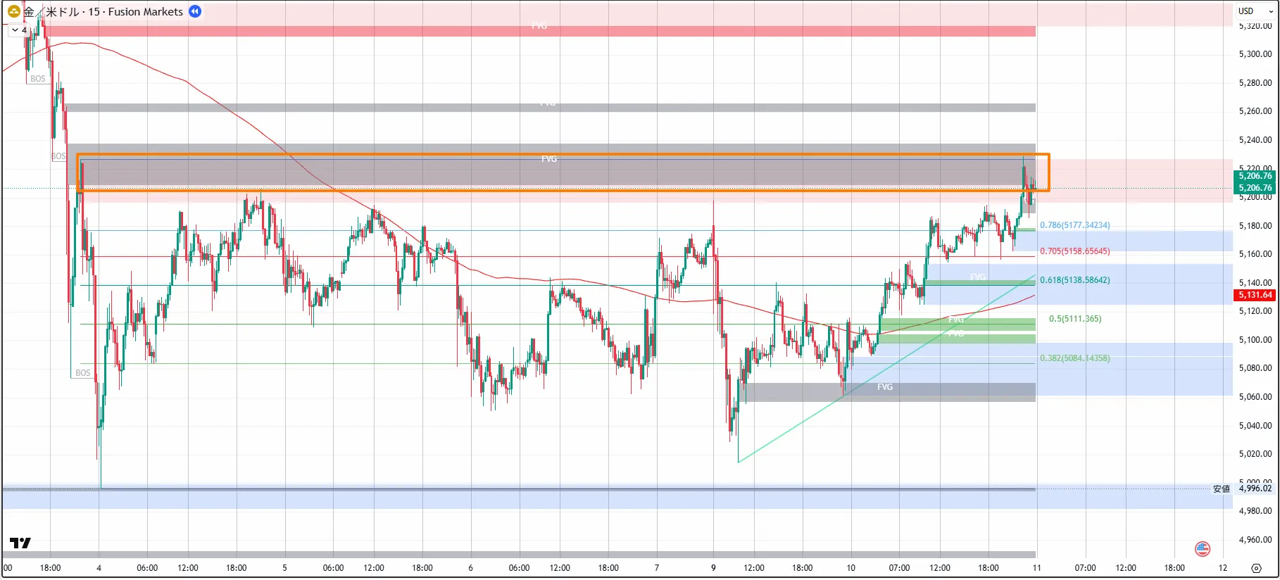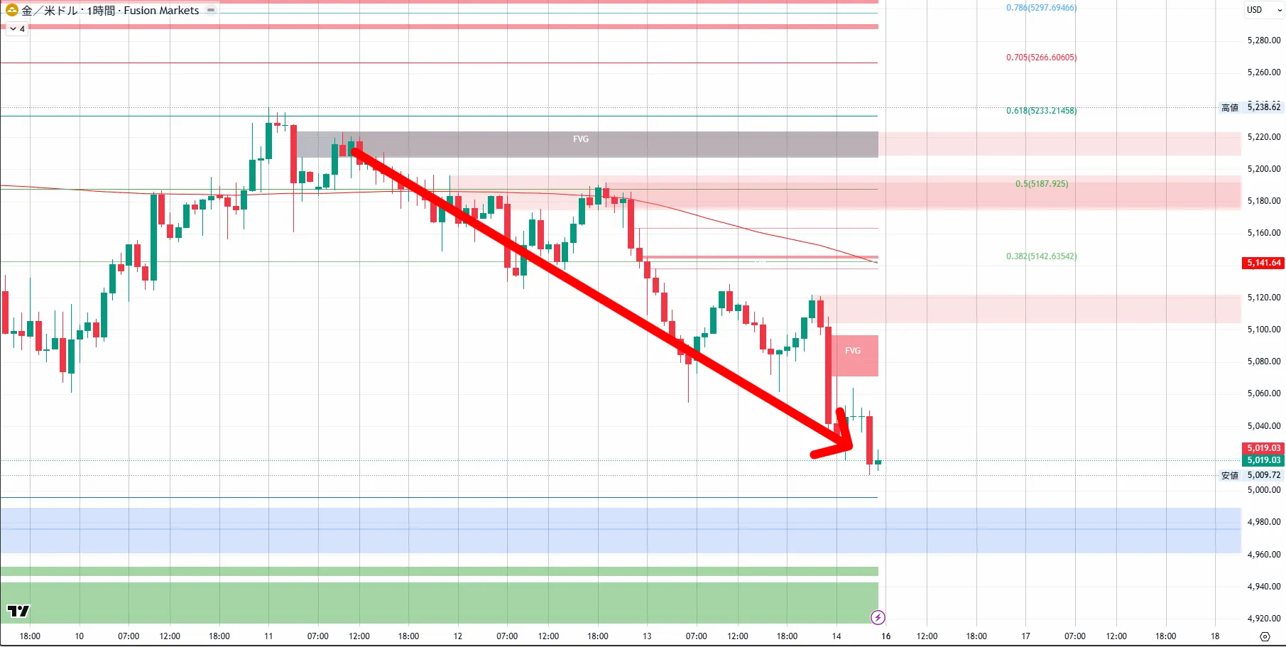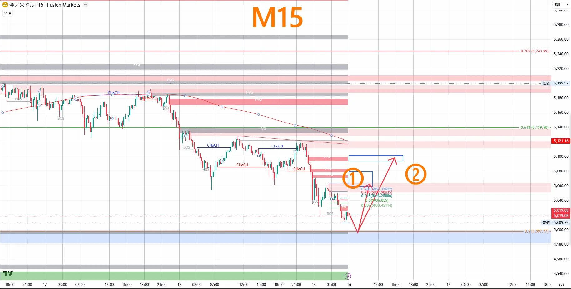 5,598.32หลังจากเกิด CHoCH ใน 4 ชั่วโมง ราคากลับลงสู่時間足CHoCHlower high・lower lowต่อเนื่องเป็นโครงสร้างตลาดขาลง月末〜2月初ต้นปีหลังจากลงทำจุดสูงสุด月28วันที่5,419.36ท้ายที่สุดราคาพุ่งขึ้นและกลับลงมา ในกราฟ 4 ชั่วโมง CHoCH ถูกยืนยัน และราคากลับลงตอนนี้時間足菲โบ (Fibonacci) EQP(4,999.91)ขึ้นถึงระดับประมาณ5,019ในช่วงสัปดาห์นี้