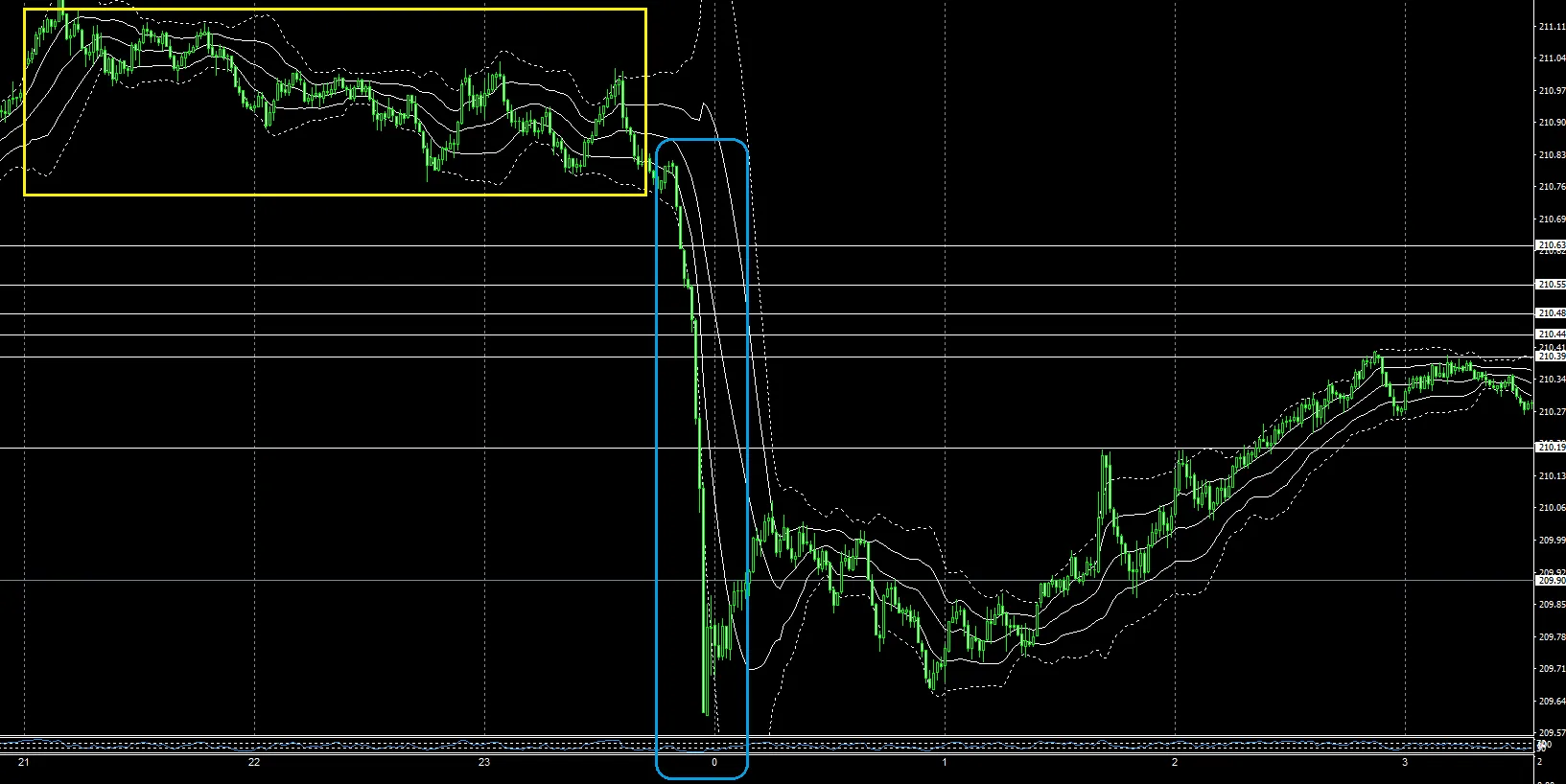 กราฟ GBP/JPY 1 นาที ในช่วงจุดสูงสุดของตลาดเมื่อคืน