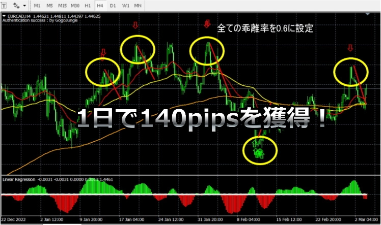 เมื่อขายซื้อด้วยสัญญาณเส้น天底ที่ใหญ่ที่สุด และใน 1 วันได้ถึง140pipsที่ได้รับ!1วันได้140,000เยนกำไร! (หากซื้อขายด้วย 100k สัญญา)140,000เยนกำไร! (หากซื้อขายด้วย 100k สัญญา)