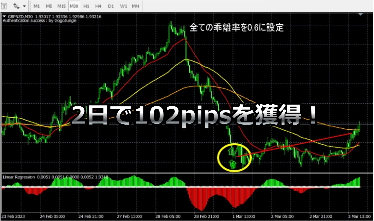 เมื่อขายซื้อด้วยสัญญาณเส้น天底ที่ใหญ่ที่สุด และใน 2 วันที่ผ่านมาได้ถึง102pipsที่ได้รับ!2วันได้102,000เยนกำไร! (หากซื้อขายด้วย 100k สัญญา)102,000เยนกำไร! (หากซื้อขายด้วย 100k สัญญา)