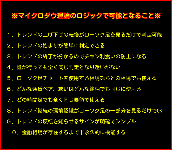 相場で利益を出すには相場が上がるタイミングと下がるタイミングを極力、正確に分からなければなりません マイクロダウ理論を使えばその反転のタイミングがズバリ分かります そのマイクロダウ理論のプライスアクション発生率は驚きの90%以上となっております またこのマイクロダウ理論は相場がある限り半永久的にお使い頂けます ダウ理論は100年以上前から使われており今も尚、相場の方向を知るロジックでは最強と言われているものです しかしながら一般的なチャートサイズのダウ理論では反転のシグナルを知るのは遅すぎるのが難点です マイクロダウ理論のローソク足サイズにダウンサイジングしたダウ理論でなら一般的なチャートサイズのダウ理論よりクイックなレスポンスで反転のサインを明確に知る事ができて強力なプライスアクションも期待できるのです その方法は小学生でも理解できるくらい簡単なロジックで指定したローソク足のある一部分を見るだけで判定できます