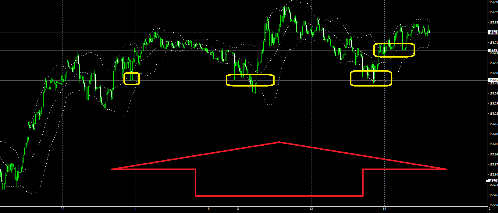 大局的に上昇している画像のボリンジャーバンドタッチや、黄色□ゾーンの様なサポレジ入れ替わり後のロング場面やサポートラインでロング仕掛けるのも良いでしょう。両建てなのであまり考えなくても良いですが・・・