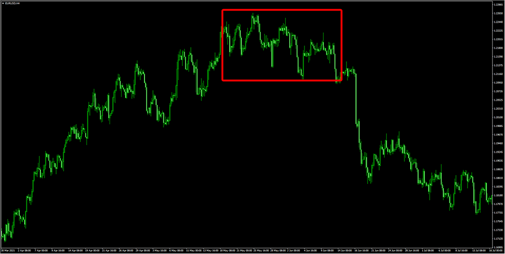 同じくEURUSDの4時間足チャートですが、こっちは誰が見ても下降トレンドだとわかります。