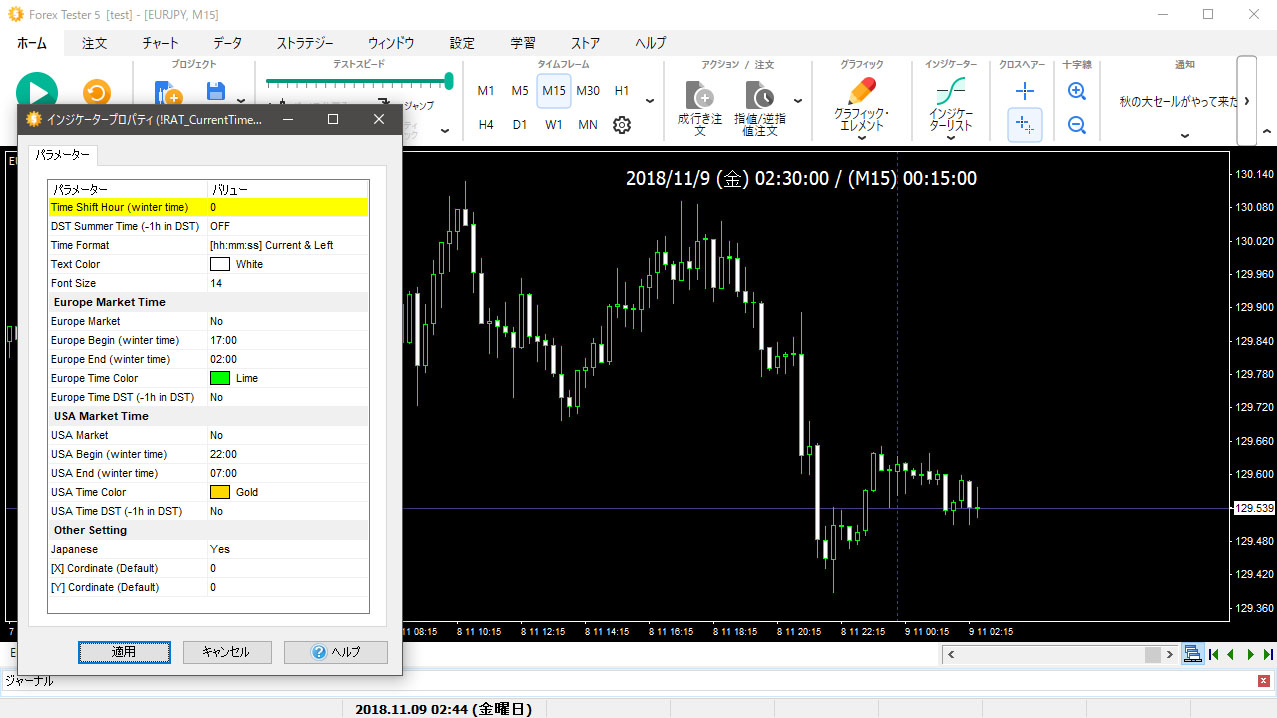 【問題】ForexTesterで日本時間に調整すると、日足の開始時間がズレて(日足6本になる)正確な検証ができません。 【解決】インジケーターで日本時間を表示する事で、日本時間を意識した検証が可能となります。