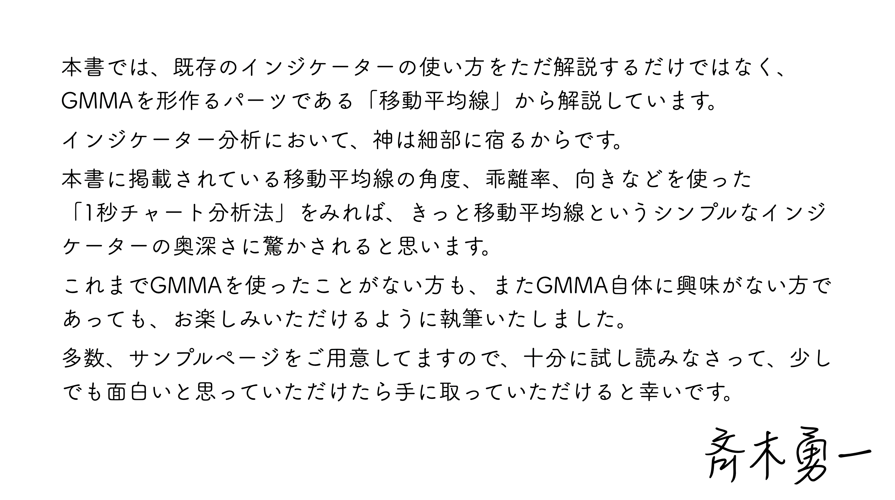 本書では、技術面、実践面で長い間GMMA触れてきた知見から、GMMAの力を最大限に引き出す方法、またGMMAを使ったトレード手法について文庫本のような形式で解説しています。