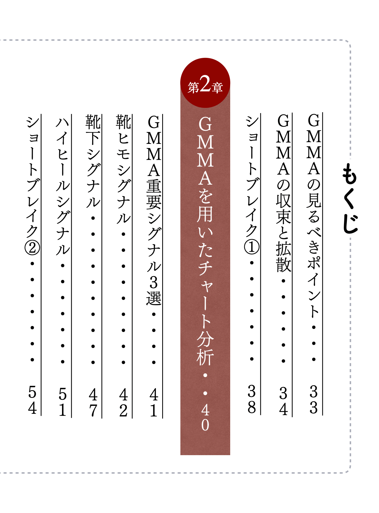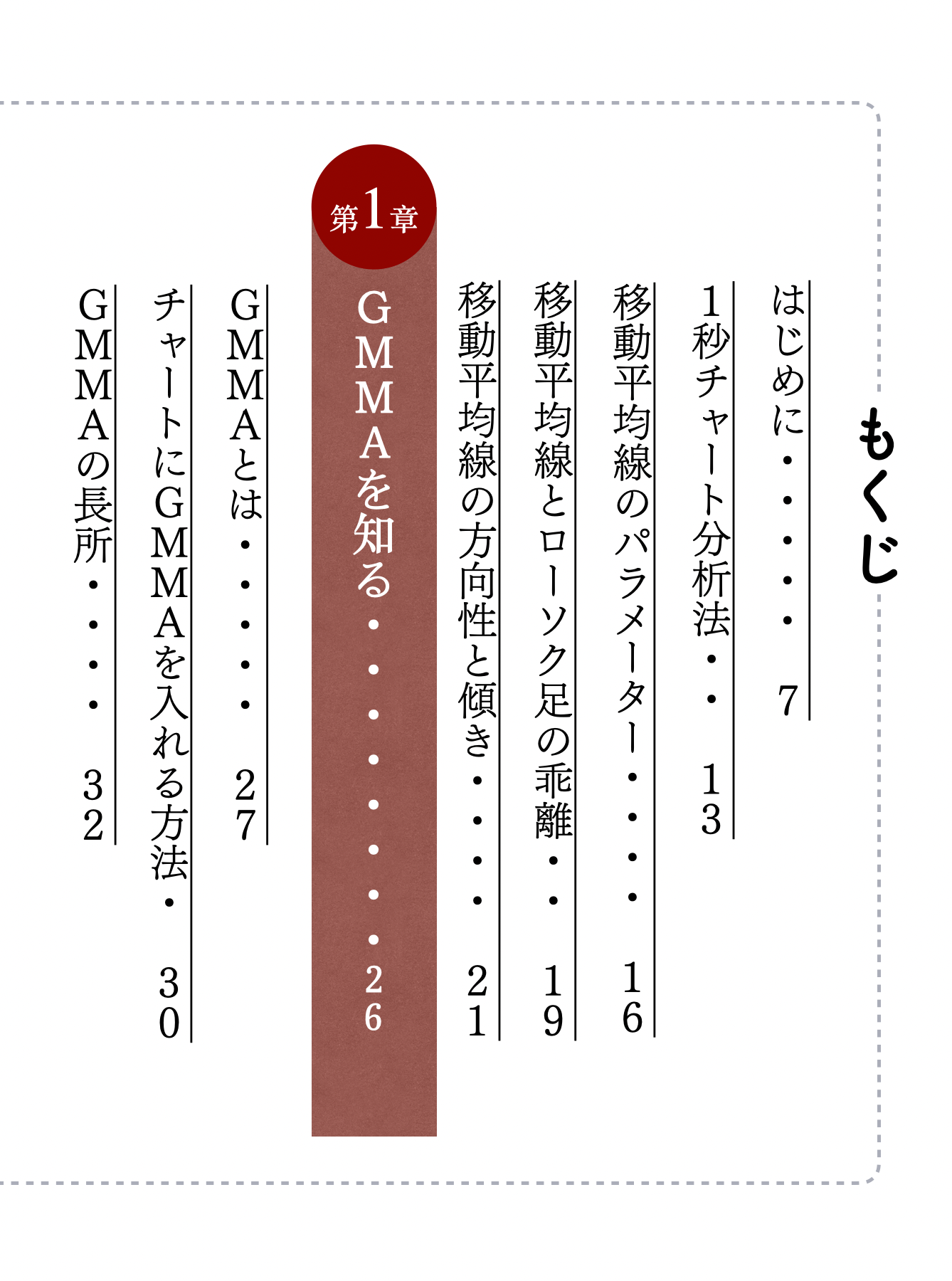 本書の最大の特徴は「GMMAは移動平均線が8本集まったものに過ぎない。」と言い切った上で、GMMAを形作るパーツである「移動平均線」から解説をしていることであり、「1つのインジケーターに徹底的に向き合う」とはどういうことなのかが体感できるようになっています。
