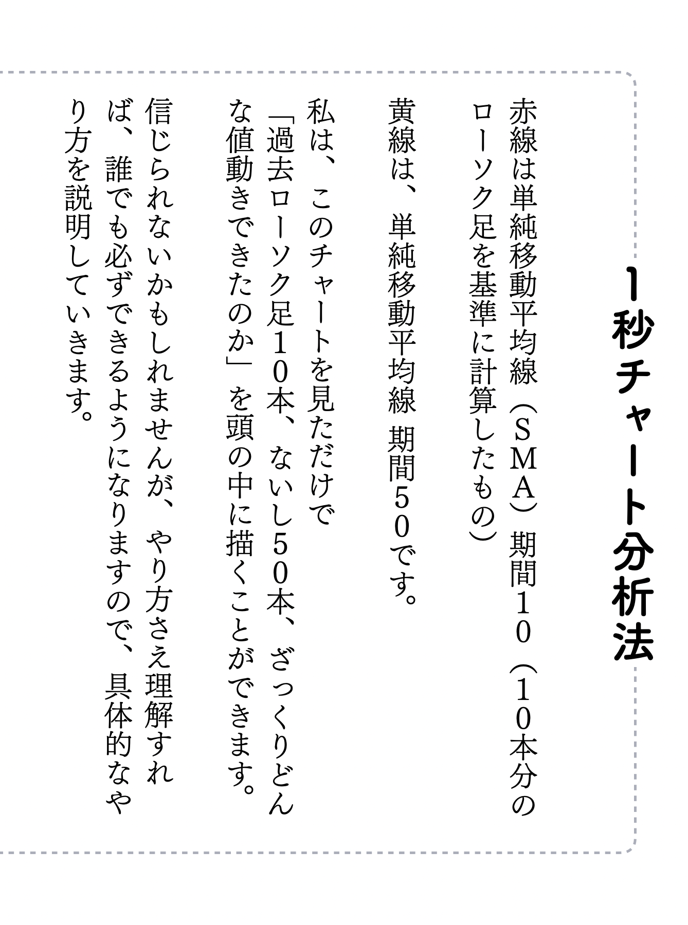 本書に掲載されている移動平均線の角度、乖離率、向きなどを使った「1秒チャート分析法」などをみれば、きっと移動平均線というシンプルなインジケーターの奥深さに驚かされると思います。