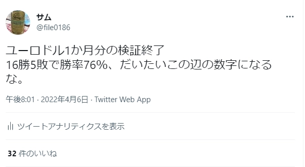 これは状況を選ばずにエントリーしていますが、負け易い所、勝ち易い所があるので厳選してエントリーして行けばまだ勝率を上げて行く事は可能です。 ちなみに、今月の私の成績は今の所は16勝2敗(88.8%)です。