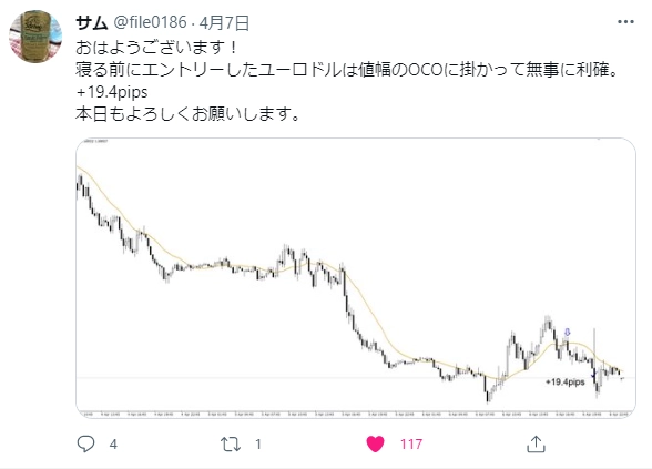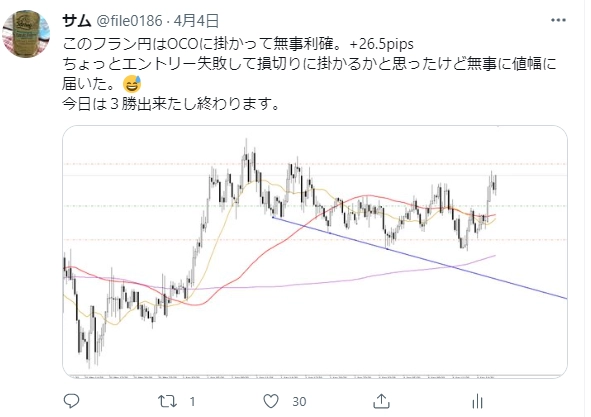 エントリーした時点で決済場所は決まってしまいますのでエントリー後はOCOを入れて見ないで済むので精神的にもかなり楽です。(利を伸ばす場合は別)