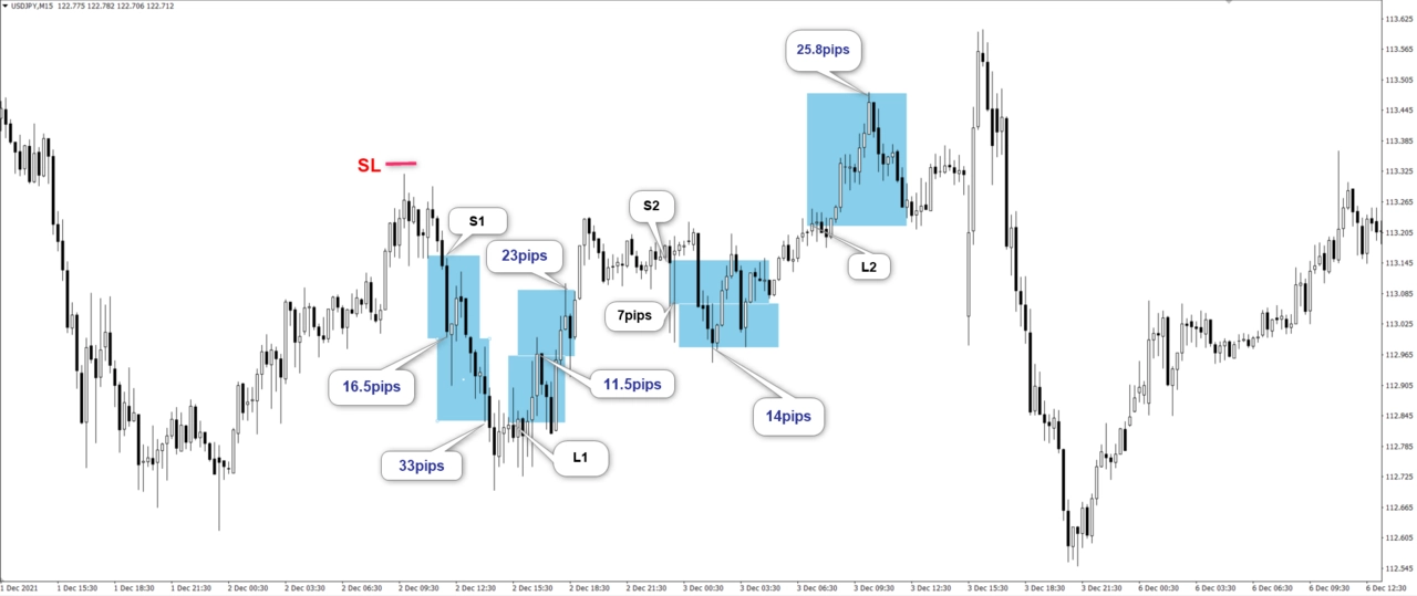 S1でエントリーして、損切り(SL)は高値に置いて決済は値幅分で+16.5pips 倍の値幅決済で+33pips と言う感じで見て下さい。 ドル円、2021年、12月の検証結果は