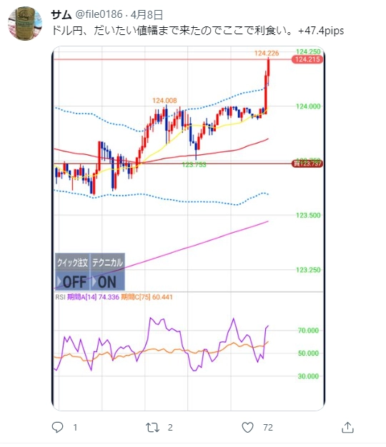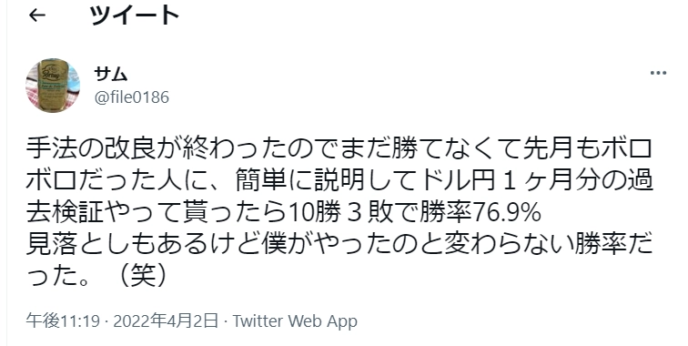Twitterでフォローさせて頂いてた上手い方が、 『分からないままダラダラとやって小銭と時間を無駄にしたり、爆益報告見てそれに飛びついて騙されたり、ちゃんと自己投資出来ない奴はトレードやっても勝てないよ!』 と言われてるのを見て、はっ!と思い自分に投資してちゃんと回収しようと10万近く払って指導を受けて、それから変わりました。
