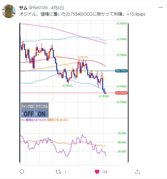 取れるpipsは10~50pipsくらいのデイトレードです。(15分足の場合) 夜も形になったらエントリーしてOCO入れて寝ちゃいますので日を跨ぐ事もあります。