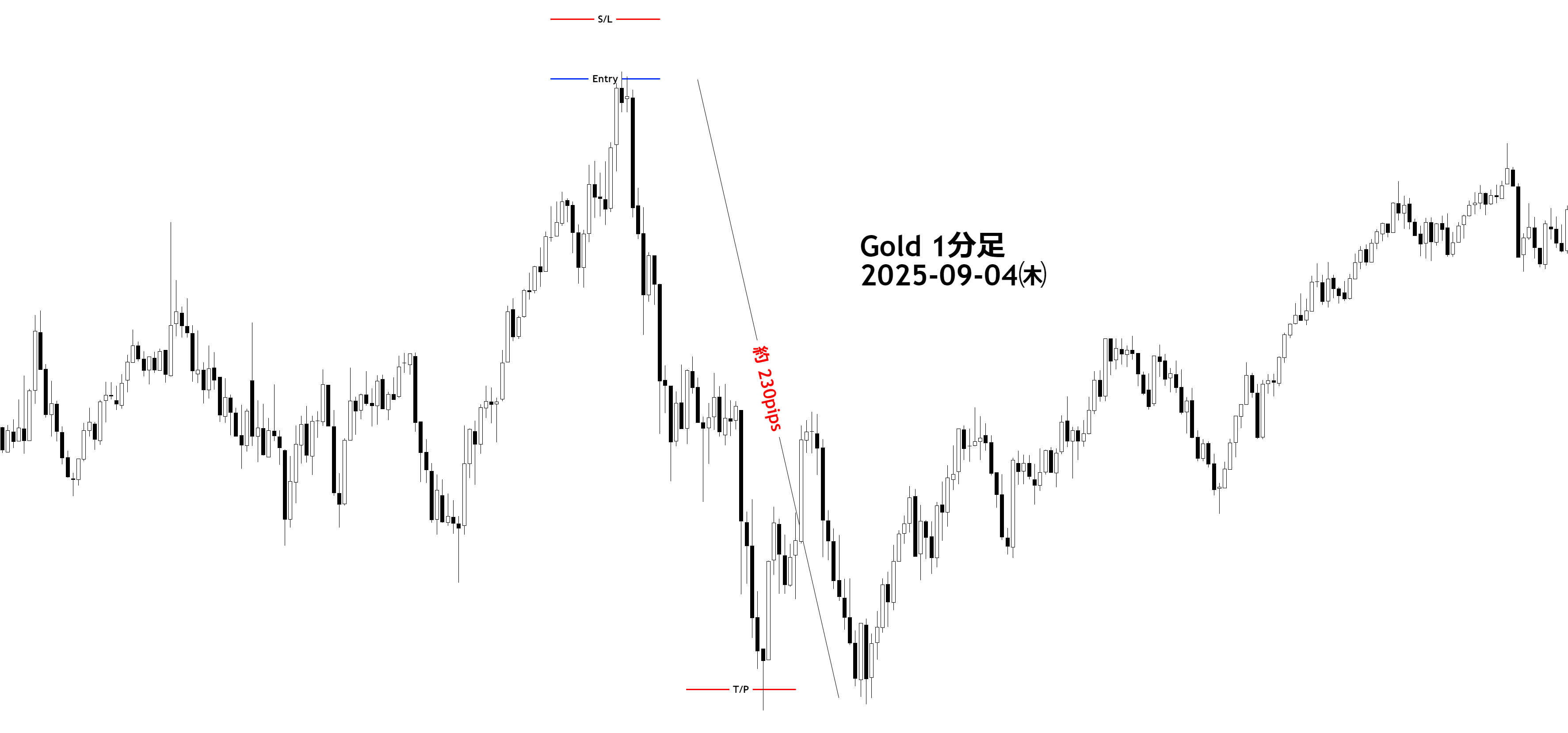 次の画像はメインの手法を用いた直近相場のトレード例です。バイナリー Gold ゴールド スキャルピング 水平線 ローソク足 Gold バイナリー Gold ゴールド スキャルピング