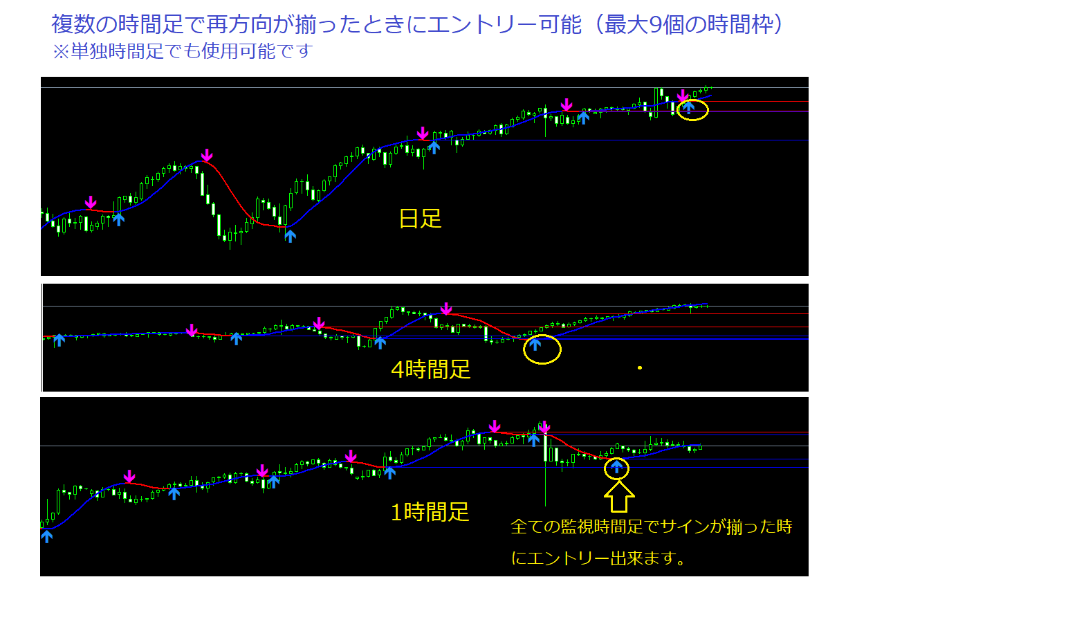 そして、複数の時間足でサインの方向が揃った時にだけエントリーする、マルチタイムフレーム(最大9個の時間足)機能を追加しました。