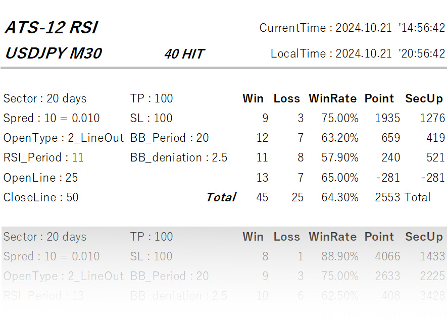 トレードの精度を高めるため、『ATS-12 RSI』で抽出された最適化データも公開しています。これにより、自身の手法に応用しやすくし、分析の効率向上が可能になります。
