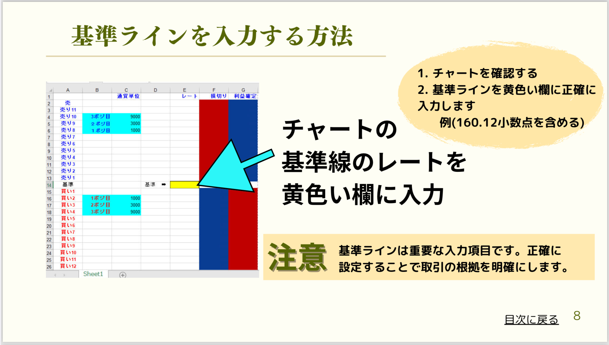Plan FXには、エントリー・利確・損切りのラインを自動計算するExcelシートが付属しています。