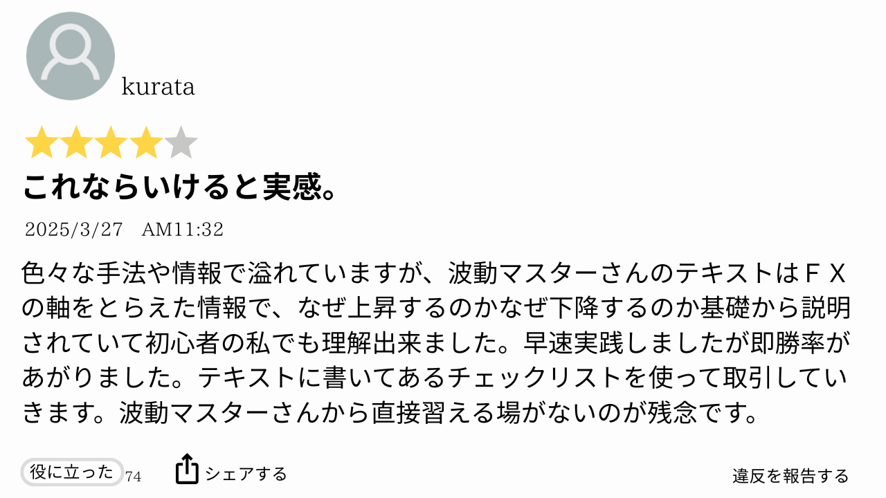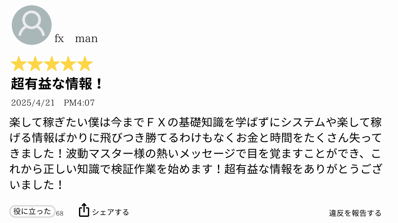 そして、楽して稼げるものはない。という衝撃的な真実から目をそらさずに、現実逃避せずに、正しい知識と正しい努力でFXと向き合った頃からFX人生が180度変わりました。