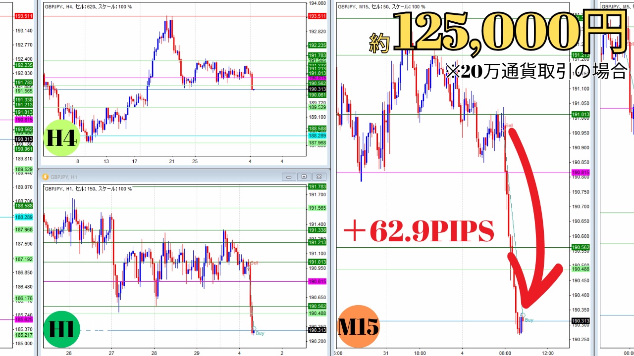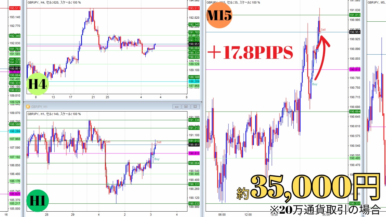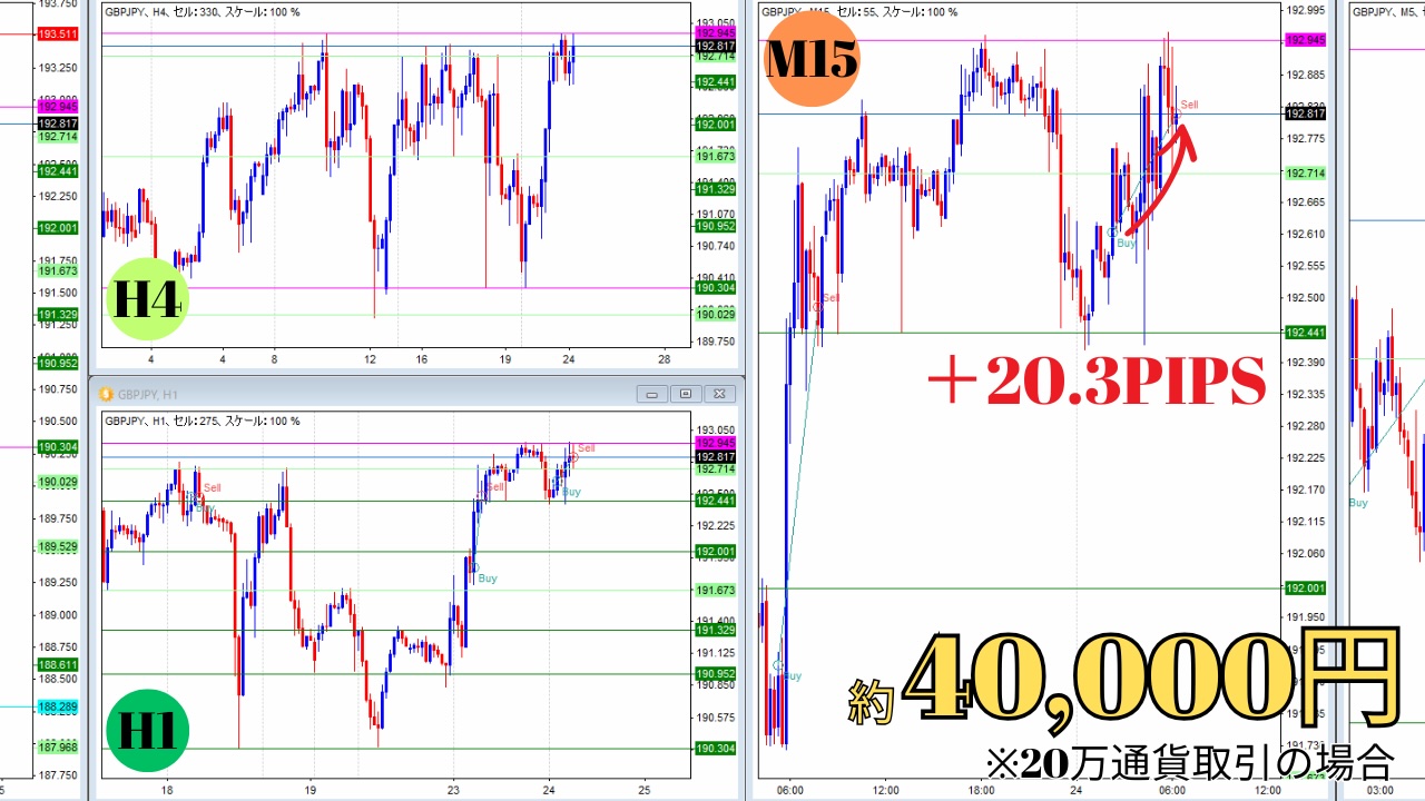 ●日足・4時間足・1時間足・15分足までの相場を水平線と波動(ダウ理論)を使って環境認識し、勝率の高いエントリーポイントを3つ導き出します。