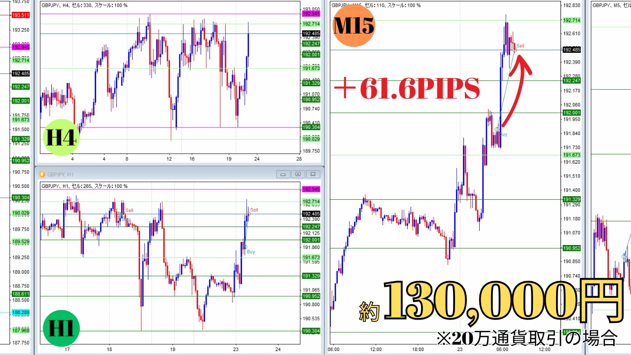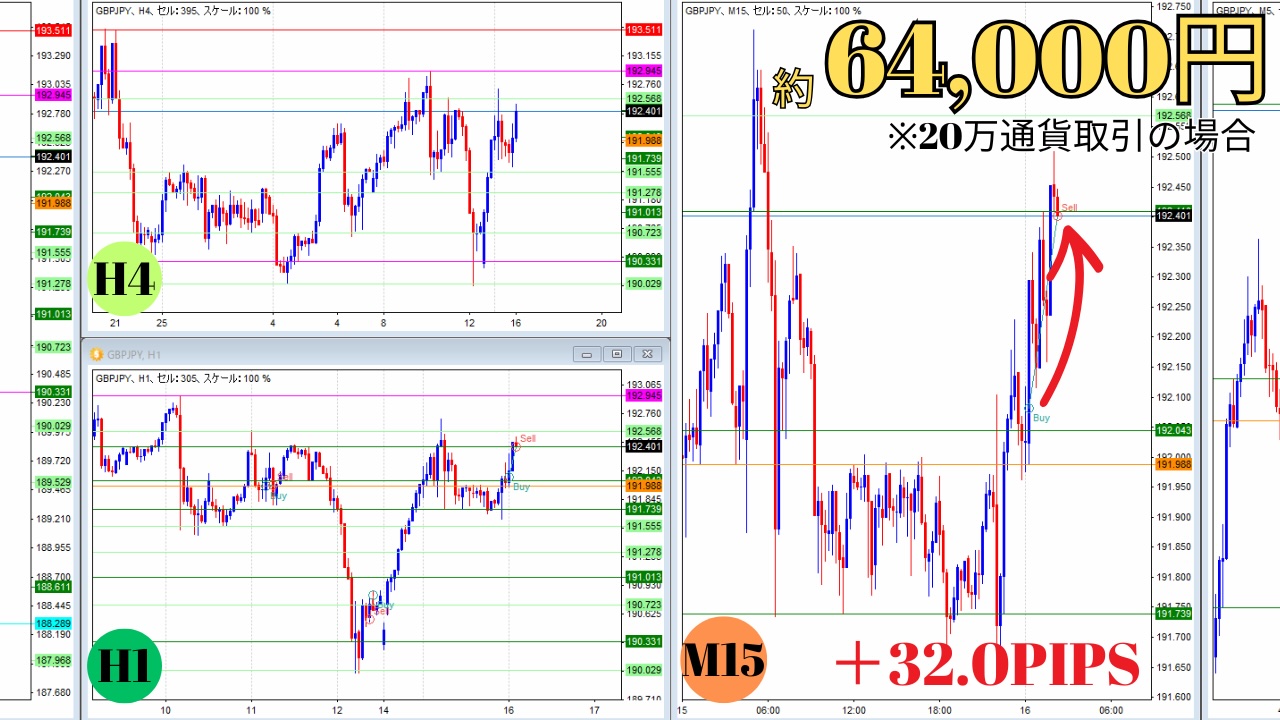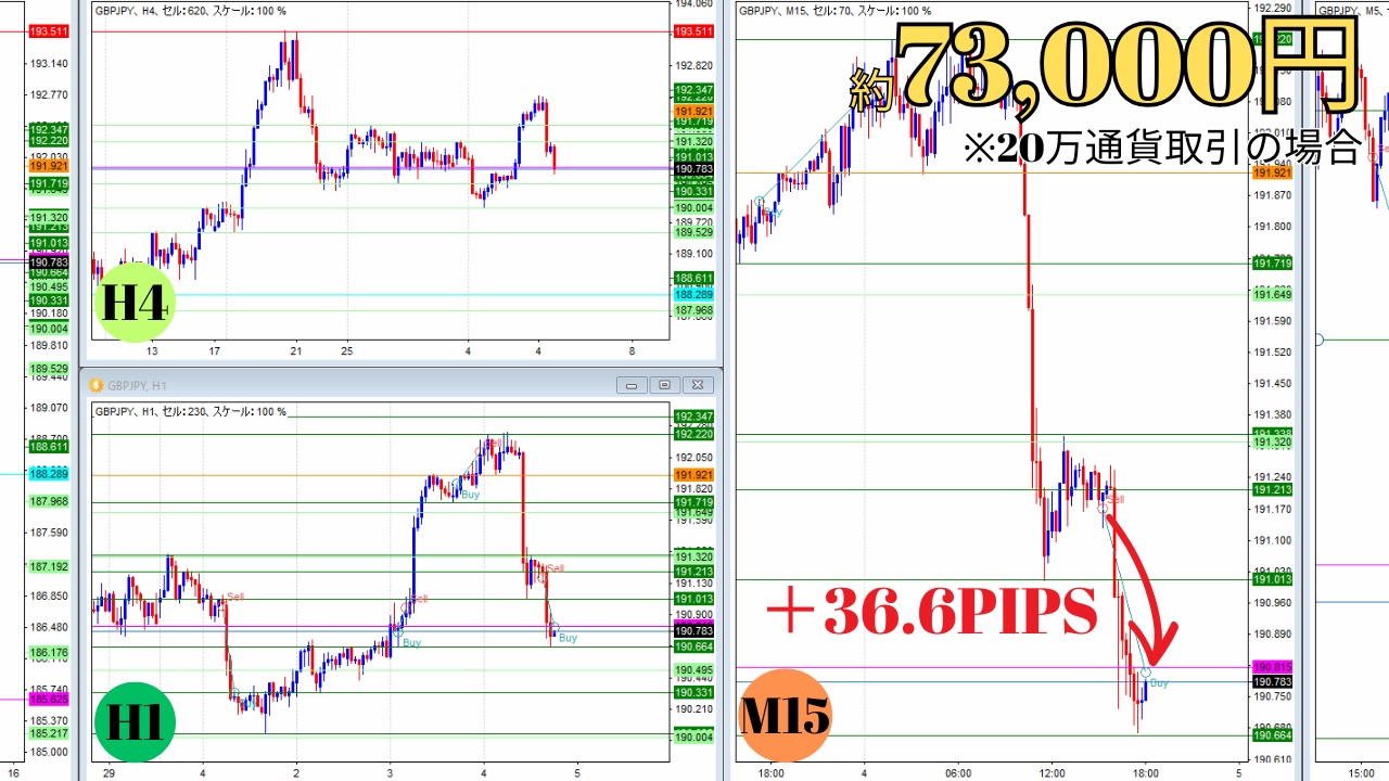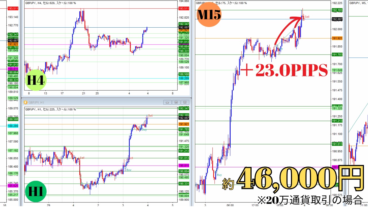 ●日足・4時間足・1時間足・15分足までの相場を水平線と波動(ダウ理論)を使って環境認識し、勝率の高いエントリーポイントを3つ導き出します。