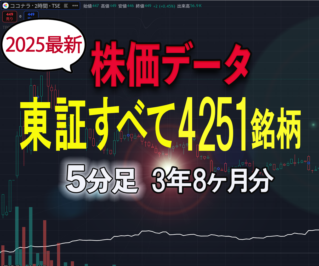 東証すべての銘柄5分足データ3年8ヵ月分(2021年11月22日~2025年7月25日)を販売いたします。