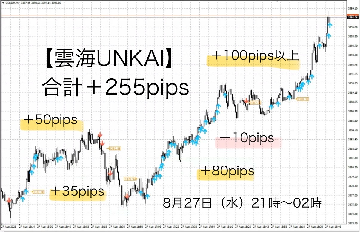 2025年8月8日、朝9時〜深夜24時までの15時間耐久テストで+819pips(約118万円換算)を記録。