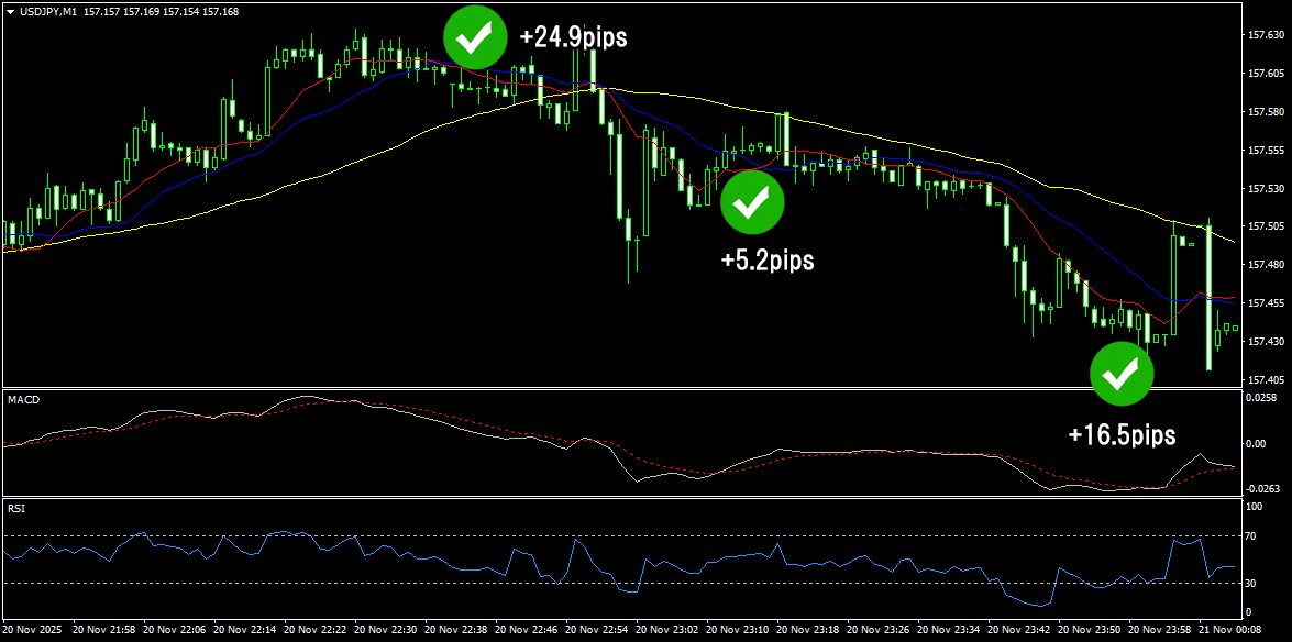 ルールもとてもシンプルで、使うのはローソク足、3つの移動平均線、MACD、RSIです。