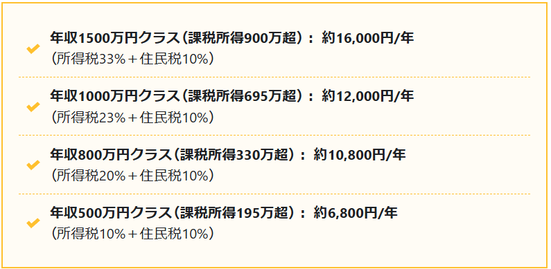 「たったそれだけ?」と思うかもしれないが、ここからがマジックだ。 年収が高い(税率が高い)人ほど、この割引効果は跳ね上がる。