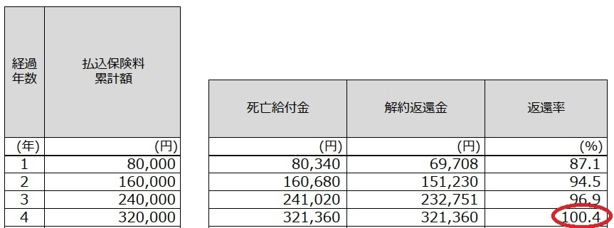 保険会社が契約書に記す「解約返戻金」だけで、4年目に100.4%を叩き出している。