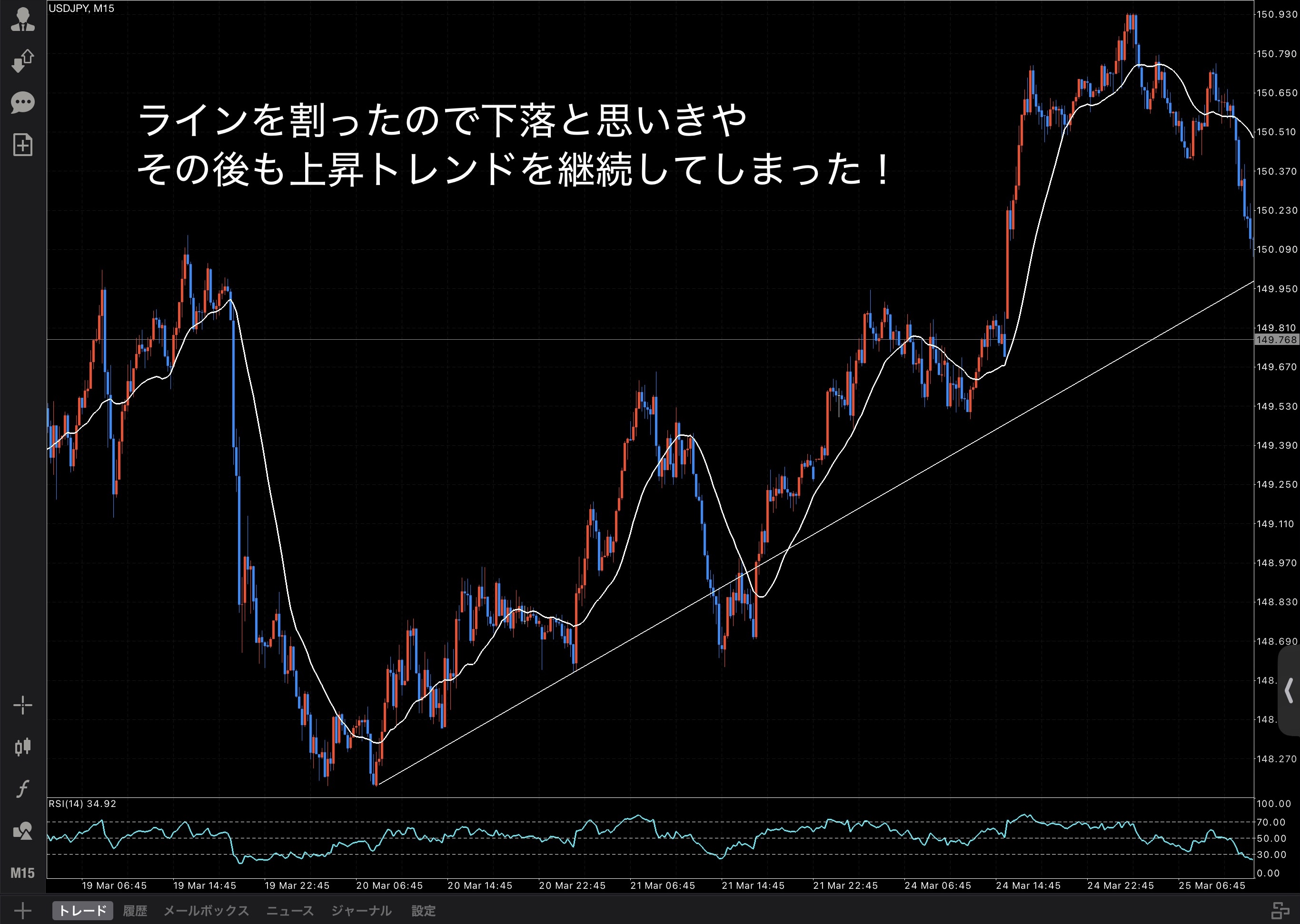 トレンドラインや水平線ラインでトレード判断をしている人がいますが、過信しすぎるのは危険です。昔の僕がそうだったので・・・汗