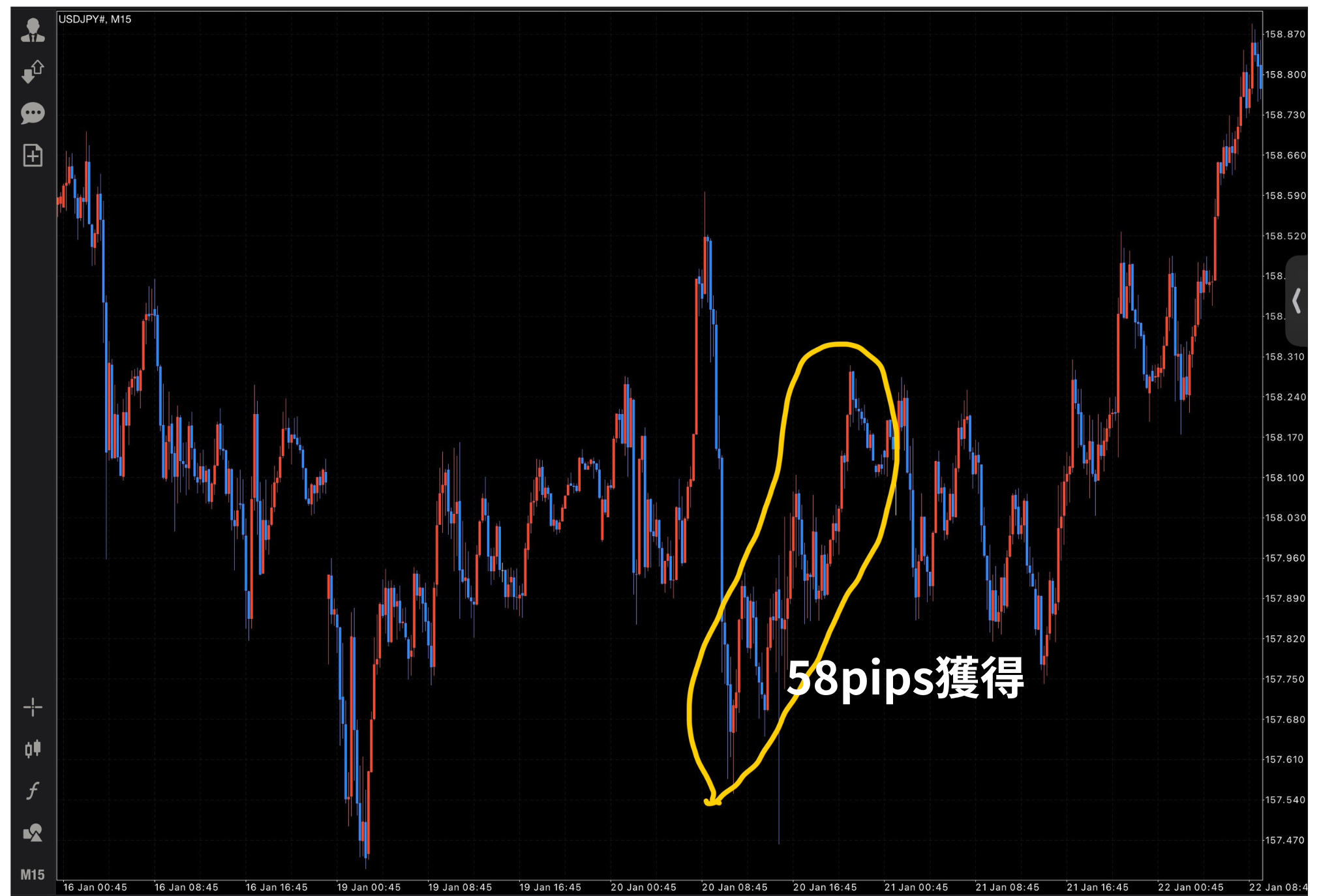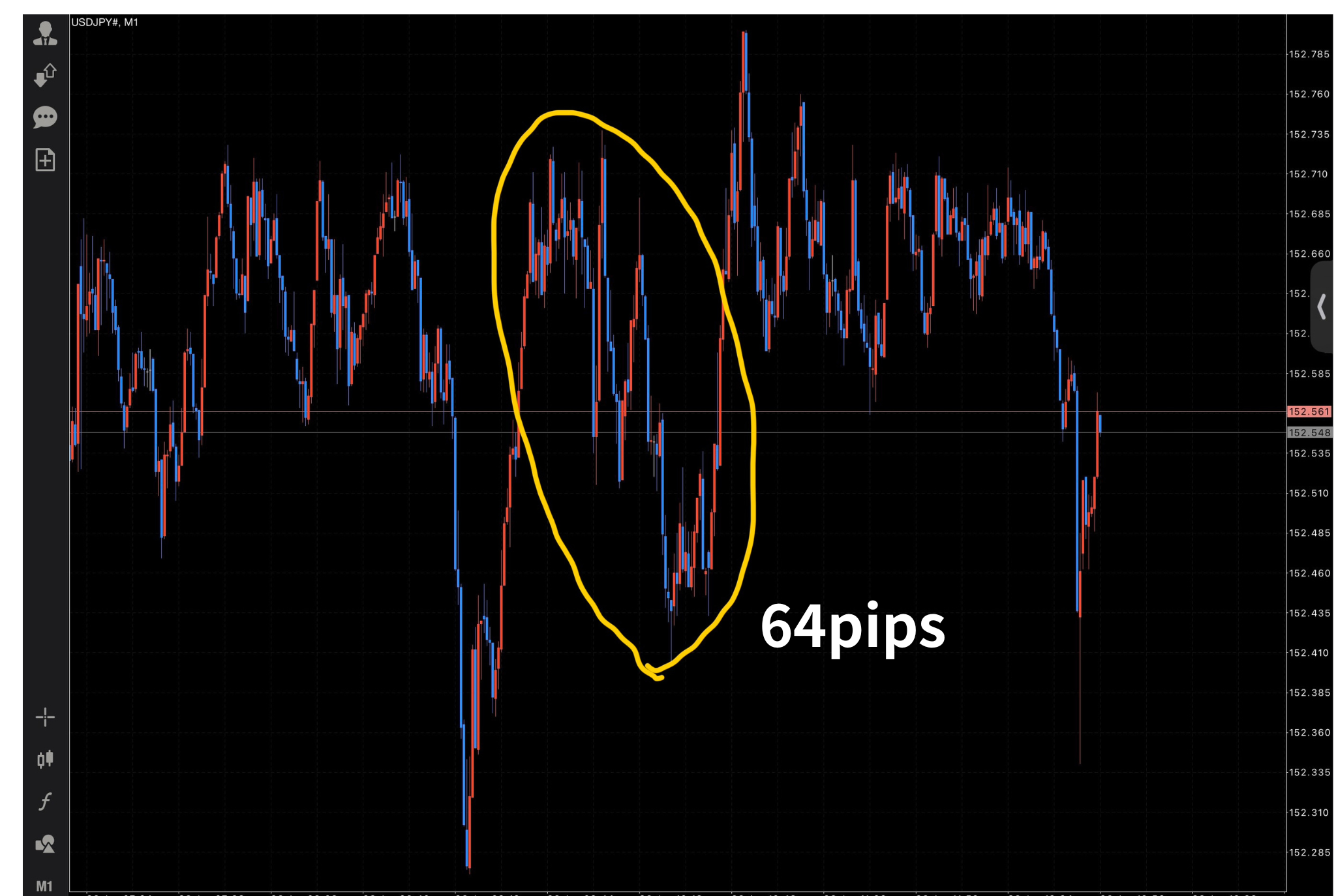 ベースの型がしっかりしているからこそ、こうしたチャンスの時に自信を持って利益を伸ばし、1回で数十pipsを悠々と抜き去ることができるのです。