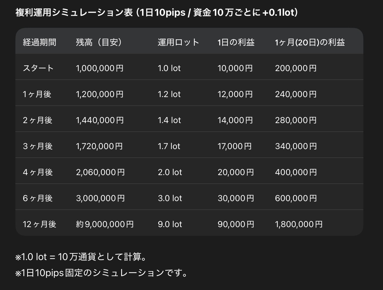 100万円の資金で1ロット(10万通貨)のポジションを持つ想定です。1日10pipsと聞くと少ないかもしれませんが、月20万の利益になる計算です。