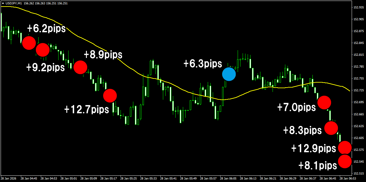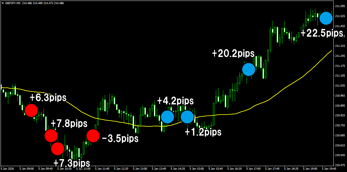 水色の●が買いエントリー、赤色の●が売りエントリーになります。 それぞれの獲得pipsです。 このエントリーと利益を1日に何十回と積み上げていきます。