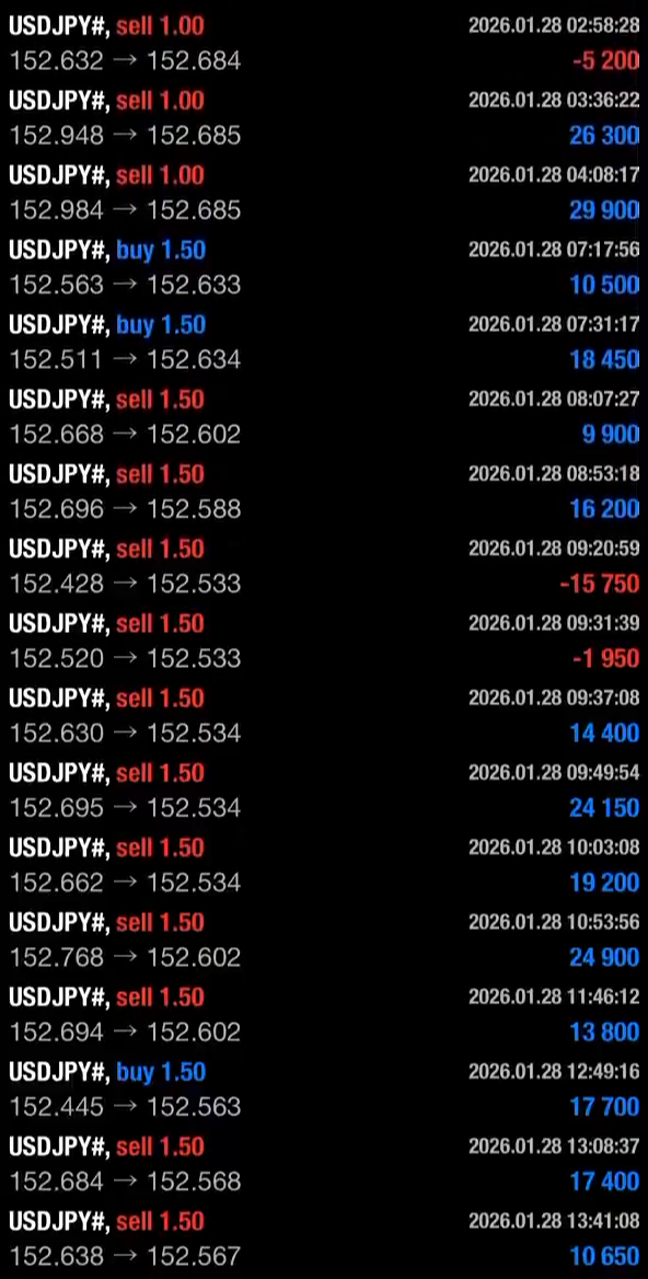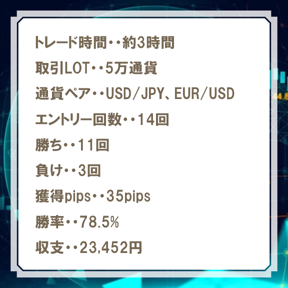 ここで一番重要な点は、 ・高勝率のロジックである。 という部分です。 スキャルピングでも勝率は重要です。 どれほど、正確なトレードでも100%は不可能です。 だからこそ、10回に8回程度は勝てる方法ですので 小さな利益を積み上げていきましょう。 では、ある1日のトレードした結果をご覧下さい。