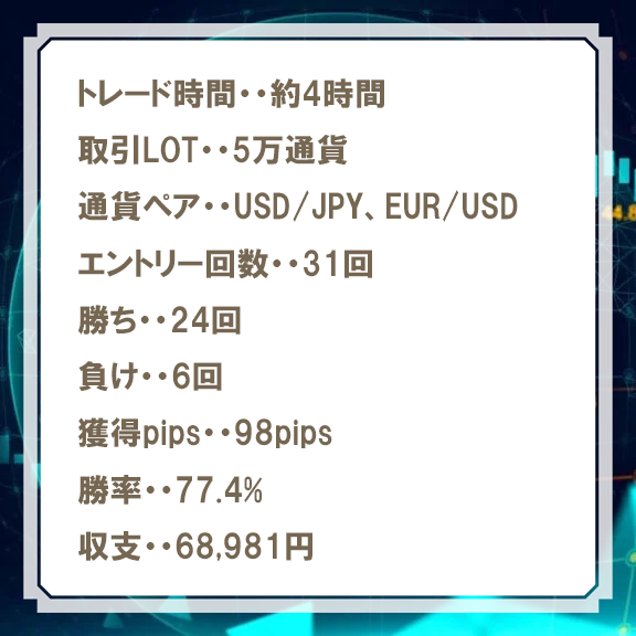 現在の私のスキャルピング手法と似ているのですが、 相場の動いているタイミングで高速にエントリーを重ねて 利益を積み上げつつ、損切りも確実に行なっていました。 これは圧巻のパフォーマンスで その後の私のトレードに大きく影響を与えました。