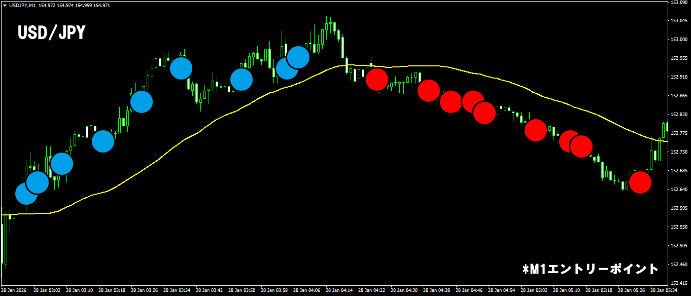 人は不思議なもので、自己流で努力していると中々能力が伸びないですが、 成功する理論や方法を学ぶことで、一気に習得して技術を身に付けることができます。 また、スキャルピングは上級者向けと思われがちですが、 経験や練習を積むことで誰にでも習得可能になるのです。 例えば、自動車の運転だと分かりやすいですが、 最初は誰でも運転はできません。 初めての運転をするとドキドキ緊張すると思います。 しかし、教習所で学び、実際の運転を繰り返すことで 自分の動きと一体化して、日常の生活の一部となり、ごく普通のことになります。 スキャルピングも同じです。 1日に50回エントリーして、+5~15pipsを何度も獲得するような手法ができるのか? そう思う方もいますが、 日々、繰り返すことで経験と技術が積み上がり、 何も苦手意識もなく、淡々とトレードに励むことができます。 こうなると、いつでもスキャルピングができて 好きな時に利益を得ることができます。 もちろん、24時間トレードができる訳ではありません。 相場に動きのある時とない時もあるからです。 ボラリティのある勝てる場面でのみエントリーしていけば 結果は勝手についてきます。 この聖杯となるスキャルピングを伝授したいのです。 ■後進を育てる理由 私がこのCandleFXで稼いでいるのなら、 わざわざ商品化せずともトレードで利益を得れば良いと考えるかもしれません。 実際にはその通りです。 但し、FXは孤独な戦いです。 自分自身が相場と向き合い続ける必要があります。 私は19年に及ぶトレードの中で 長きに渡り第一線で活躍してきましたが、 誰かにこの手法を教えることも大切だと思うようになりました。 ネットにはFXの情報が溢れています。 その中で有益な情報は一握りかも知れません。 ましてや、安定して勝てるスキャルピングは 少数のプロトレーダーの中でのみ再現されて 夢のような話として、一部のみ公開されているだけです。 私が感じたことはFXを始める人も多いが やめていく人も多いことです。 是非、勝てる手法を身に付けて FXを長く続けてもらいたいと思います。 そして、人の役に立ち社会貢献に繋がればと思います。 それがFX業界を活性化させて 皆さんの安定した収入を得ることになると願っています。 また、私と同じ手法を身に付けることで このスキャルピングの分野も発展して さらなる手法が開発されていくことを期待しています。 ■取引チャートの掲載 どのような流れでトレードをするのかは イメージできたかと思いますが、 ここからは実際の取引チャートを見ていきます。 エントリーポイントは次のようになります。