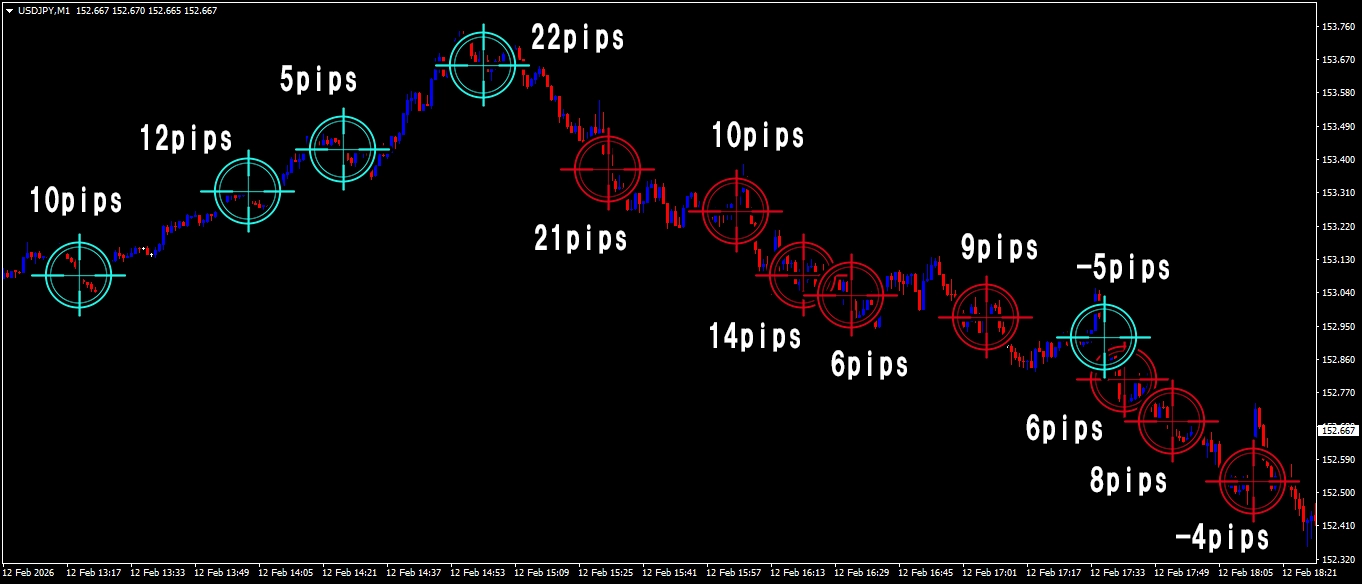 画像をご覧いただくと分かる通り、ターゲットマークの位置が決済ポイントです。 そして注目していただきたいのは、そのときにしっかり積み上がっているpipsの数字です。 10pips、12pips、5pips、22pips…。 大きなトレンドではしっかり伸ばし、短い波でもコツコツ確保しているのが分かると思います。 一度に何百pipsも狙うギャンブルのようなトレードではありません。 「取れるところを、無理なく取る」 これを積み重ねているのが、この結果です。 しかも、上昇だけでなく下落でもしっかり取れている点もポイントです。 相場が上でも下でもチャンスに変えられる。 これが安定につながります。 もちろん、マイナスの場面もあります。 ですが、その損失は小さく抑えられています。 大きく勝ち、負けは小さく。 このバランスがあるからこそ、トータルで積み上がっていきます。 チャートに張り付いて勘に頼るトレードではなく、 決められたポイントで入り、決められたポイントで出る。 だからこそ、同じような結果を目指せるのです。 「これなら自分にもできそう」 そう感じていただける内容ではないでしょうか。 一発逆転ではなく、着実に増やしていく。 その積み重ねが、やがて大きな資産につながっていきます。 RCIを使ったこのトレードは、派手さよりも“現実的な強さ”があります。 安定して積み上げたい方にこそ、体感していただきたい内容です。 結論は…。 RCIとローソク、移動平均線により精度の高いエントリーが可能! これらを利用することで、シンプルかつ期待値の高いプロ並みのトレードができるなるので、ぜひご期待ください。 3:どんなトレードスタイルにも対応 人それぞれ、生活スタイルは違いますよね。 ● 日中もチャートをよく見られる方 ● 朝や夜だけチェックできる方 ● 忙しくてあまりチャートを見られない方 さまざまだと思います。 よくあるツールは、特定のトレードスタイルにしか対応していないものが多いです。ですが、私のツールは違います。 ● 5分足のスキャルピング、 ● 15分足のデイトレード、 ● 1時間足のスイングトレードまで対応しています。 そのため、ご自身の生活リズムに合わせて無理なく取り組むことができます。 ちなみに、バランスが良くおすすめなのは15分足のデイトレードです。利益率とエントリー回数のバランスが取りやすいのが特徴です。 たとえば、 ● チャートをしっかり見られる方は5分足で短期売買 ● 朝や夜に時間が取れる方は15分足でデイトレ ● あまり時間が取れない方は1時間足でゆったり運用 といった形で、自分に合ったスタイルを選べます。 無理をせず、自分の生活に合わせて続けられること。 それも、長く安定していくための大切なポイントです。 4:王道でシンプルな資金管理をしっかり身につける FXで長く勝ち続けたいなら、テクニックよりも先に身につけるべきものがあります。 それが「資金の守り方」です。 どれだけ優れた手法を使っても、資金の扱い方を間違えてしまえば、結果は安定しません。 逆に言えば、資金管理さえしっかりしていれば、大きく崩れることはなくなります。 では、難しい計算や特別な理論が必要なのかというと、そうではありません。 本当に大切なのは、昔から変わらないシンプルな考え方です。 派手な名前のついた複雑な方法よりも、「当たり前のことを守る」ことの方がはるかに強力です。 RCI SYSTEMでは、その基本となる資金管理を、実際に使える形でお伝えします。 ただ知識として知るだけではなく、自然と実践できるレベルまで落とし込みます。 さらに、初心者の方でもすぐに活用できる専用の管理シートをご用意しています。 数字を入力するだけでリスクの目安が分かるので、難しい計算を覚える必要はありません。 資金を守る力が身につけば、トレードは一気に安定します。 「増やす」前に「減らさない」こと。 この土台ができたとき、あなたのFXは本当の意味で変わり始めます。 ぜひ、活用してください。