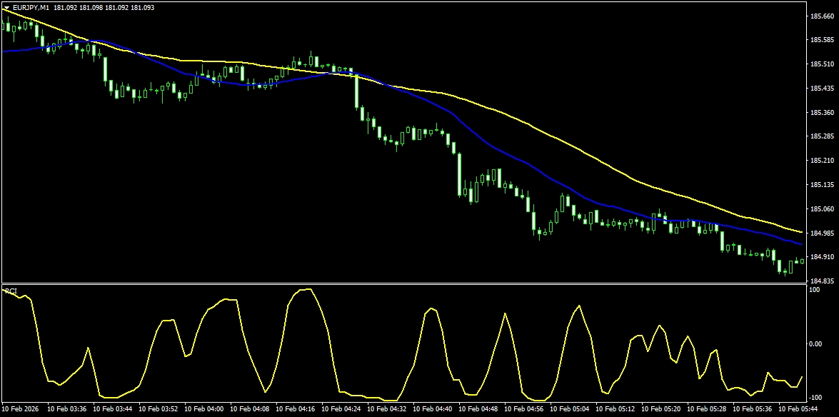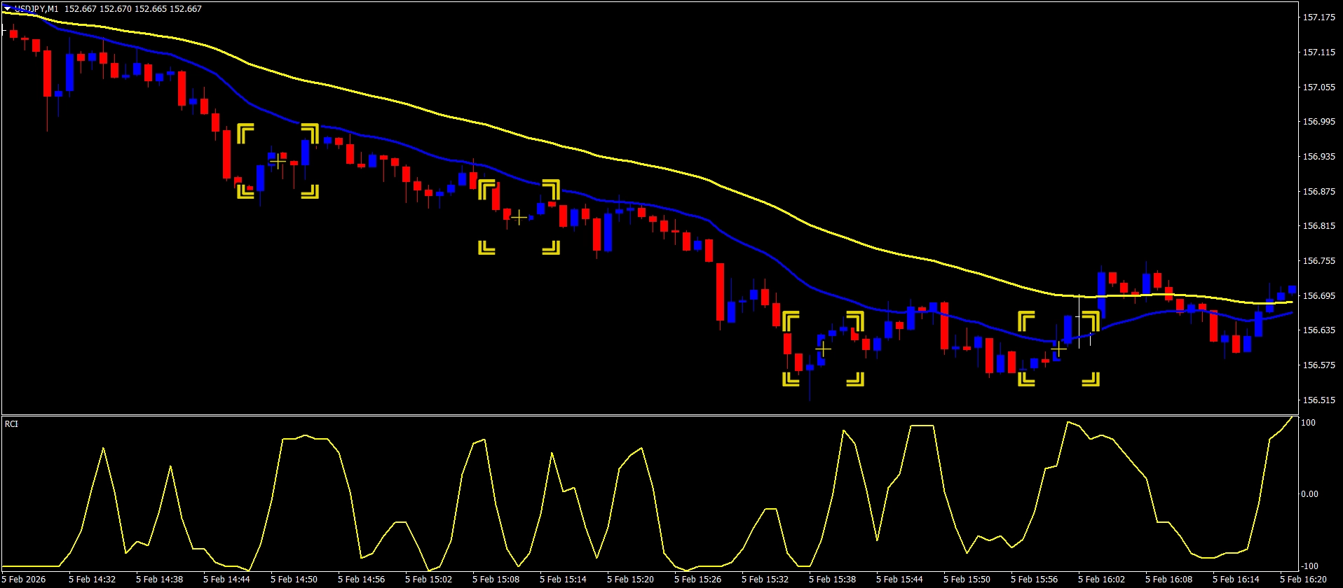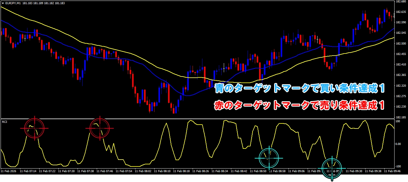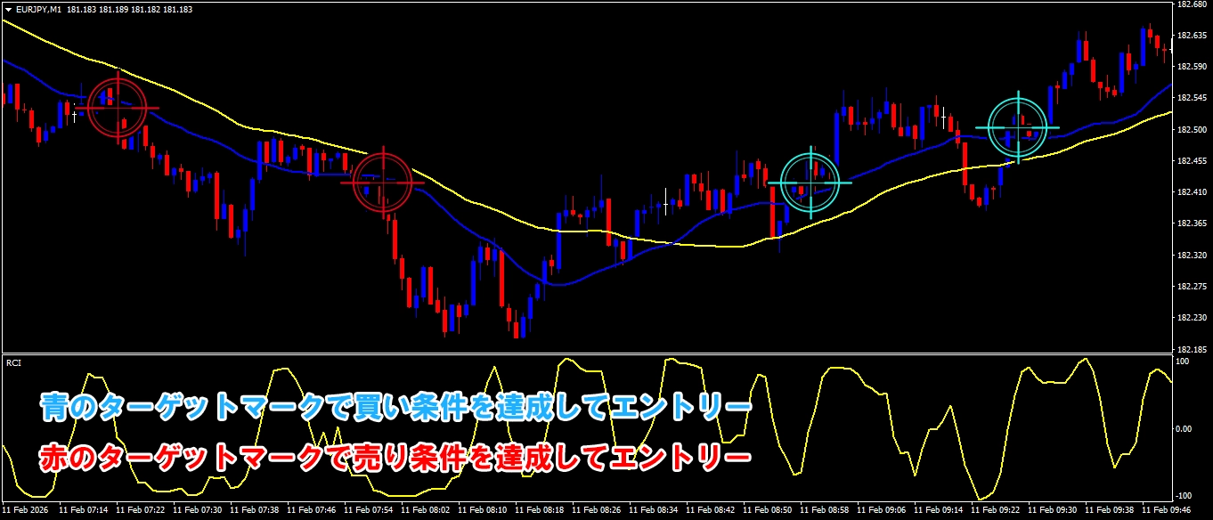 RCIを活用したトレード手法の「RCI SYSTEM」は、 相場の流れに素直に乗る、とてもシンプルで再現性の高い方法です。 難しい判断はできるだけ減らし、 「今は上なのか、下なのか」をはっきりさせてからエントリーします。 チャートでは、移動平均線を活用して、安定して推移していると判断します。 これは「上昇の流れが続いている」高確率のサインです。 その流れに合わせて、 RCIが下がったところからタイミング=「押し目」の可能性が高いポイントを狙います。 上昇トレンド中の一時的な下げを拾うイメージです。 これにより、高値づかみを避けながら、安定したエントリーができます。 また、しっかり利益を確定することで、コツコツと積み上げることができます。 ■EUR/JPY M1