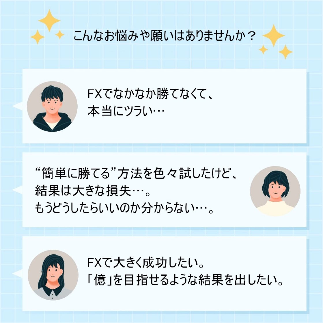 そんな経験をしていませんか? それでも心のどこかで、 「FXで大きく成功したい」 「いつかは億を目指したい」 そんな夢をあきらめきれずにいるのではないでしょうか。 不安や焦りを感じるのは、それだけ本気だからこそです。 あなただけではありません。同じ思いを抱えている人はたくさんいます。 あきらめる前に、もう一度だけ、正しい方法を一緒に探して欲しい。