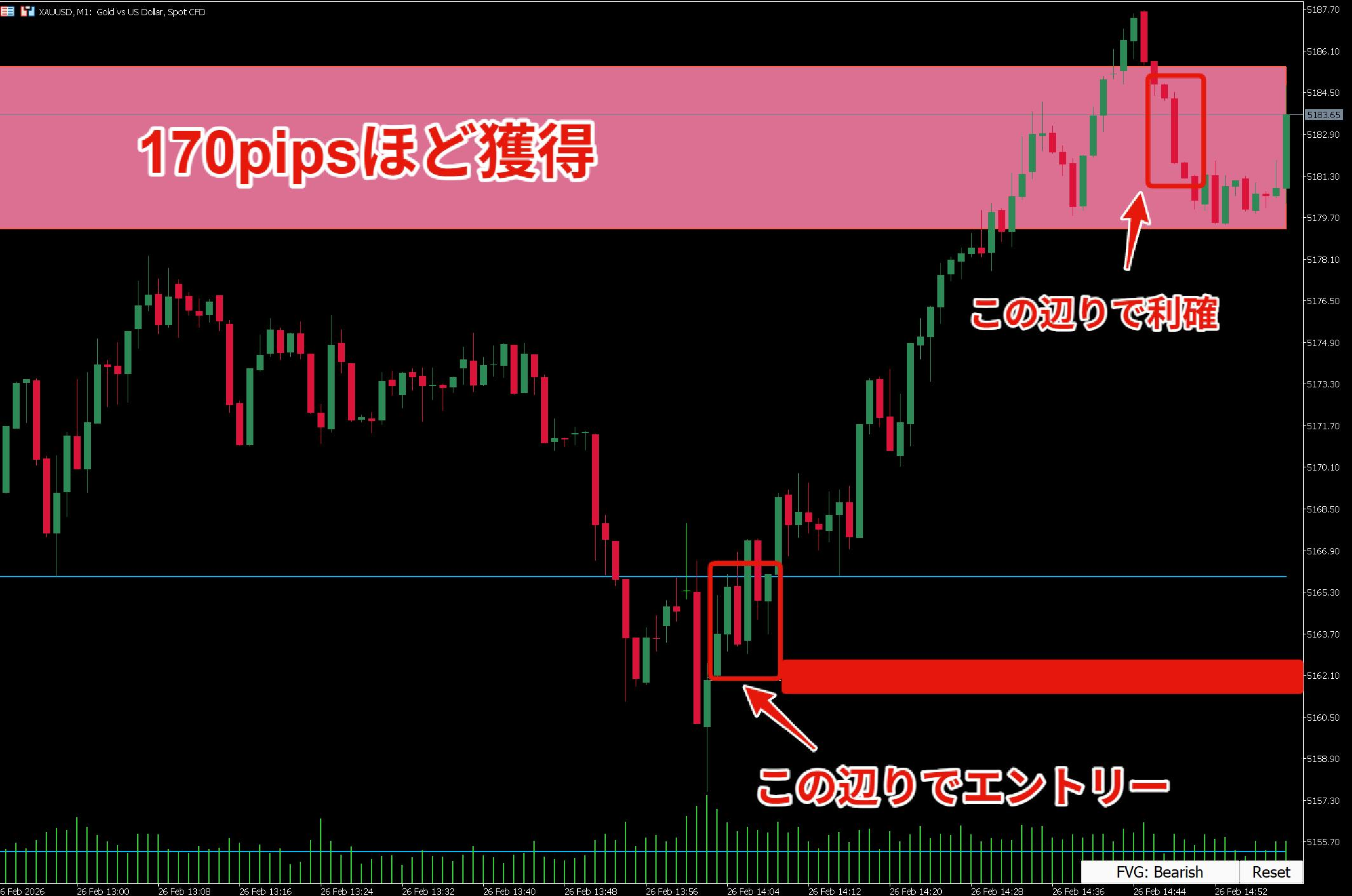 そのラインを背にしてエントリーした途端、勢いよくラインを割って損切りにかかり、直後に本来予想していた方向へ勢いよく飛んでいった……