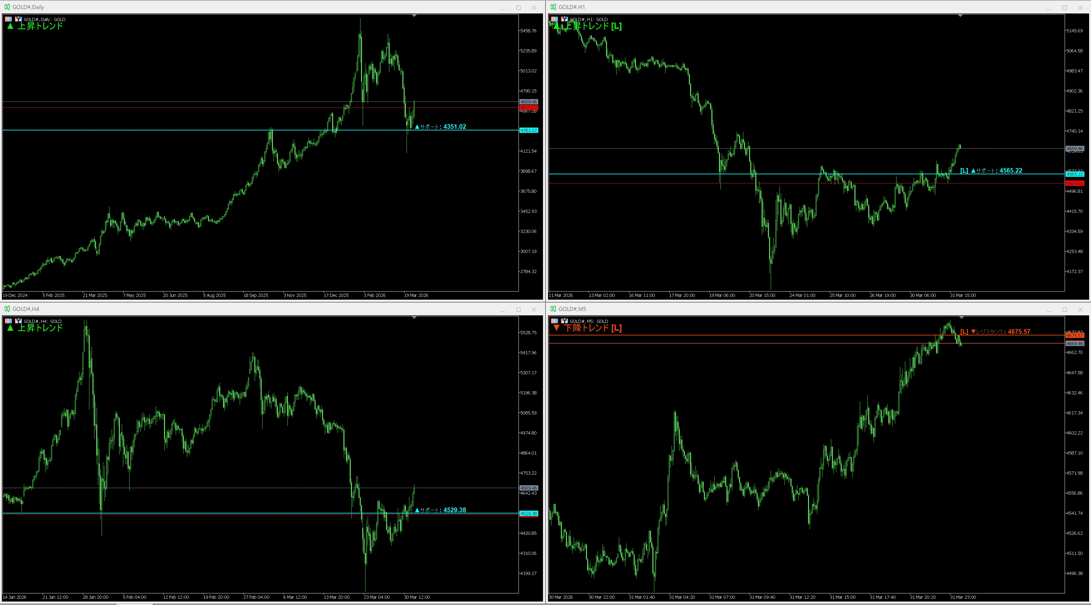 日足 → 4時間足 → 1時間足で上位足のトレンドを確認し、5分足のN波でエントリーします。