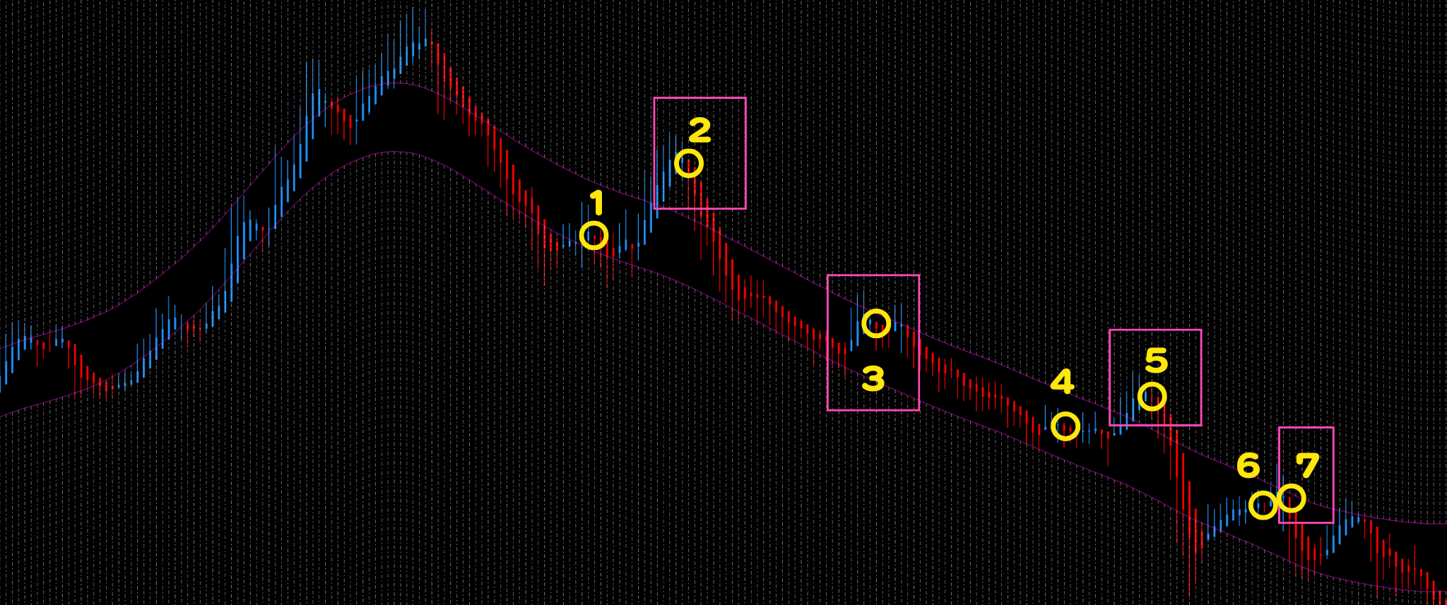 例えば、上記画像は下降トレンドの画像(ドル円1分足)ですが、平均足が青から赤に変わった黄色の丸でショートエントリーした場合、①④⑥番は直近の高値を抜けたので損切りになりますが、②③⑤⑦はしっかりと値幅が取れる良いエントリーになります。