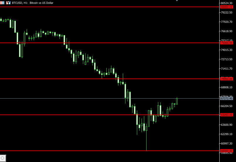 ラインの間隔は、pips単位かチャートの単位を選択出来ます。 100pips単位や、100円単位で指定出来ますので、値幅が大きい通貨ペアでも間隔が分かりやすくなります。 例えばBTCUSDでは、「チャートの単位」にして間隔を「5,000」にすると、5,000ドル間隔でラインを引きます。 BTCUSDは値幅が大きいため、ドル単位で間隔を広めに設定すると見やすくなります。