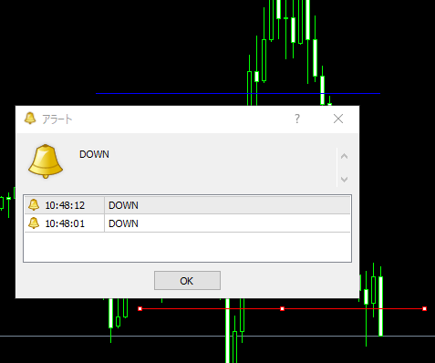 アラートが鳴ると、ボタンの背景色が変わります。 上タッチと下タッチで個別に設定が可能です。 パラメーターで秒数を設定すると一定時間、色が変わったままになります。 そのため、どのチャートでアラートが鳴ったのか判断しやすくなります。